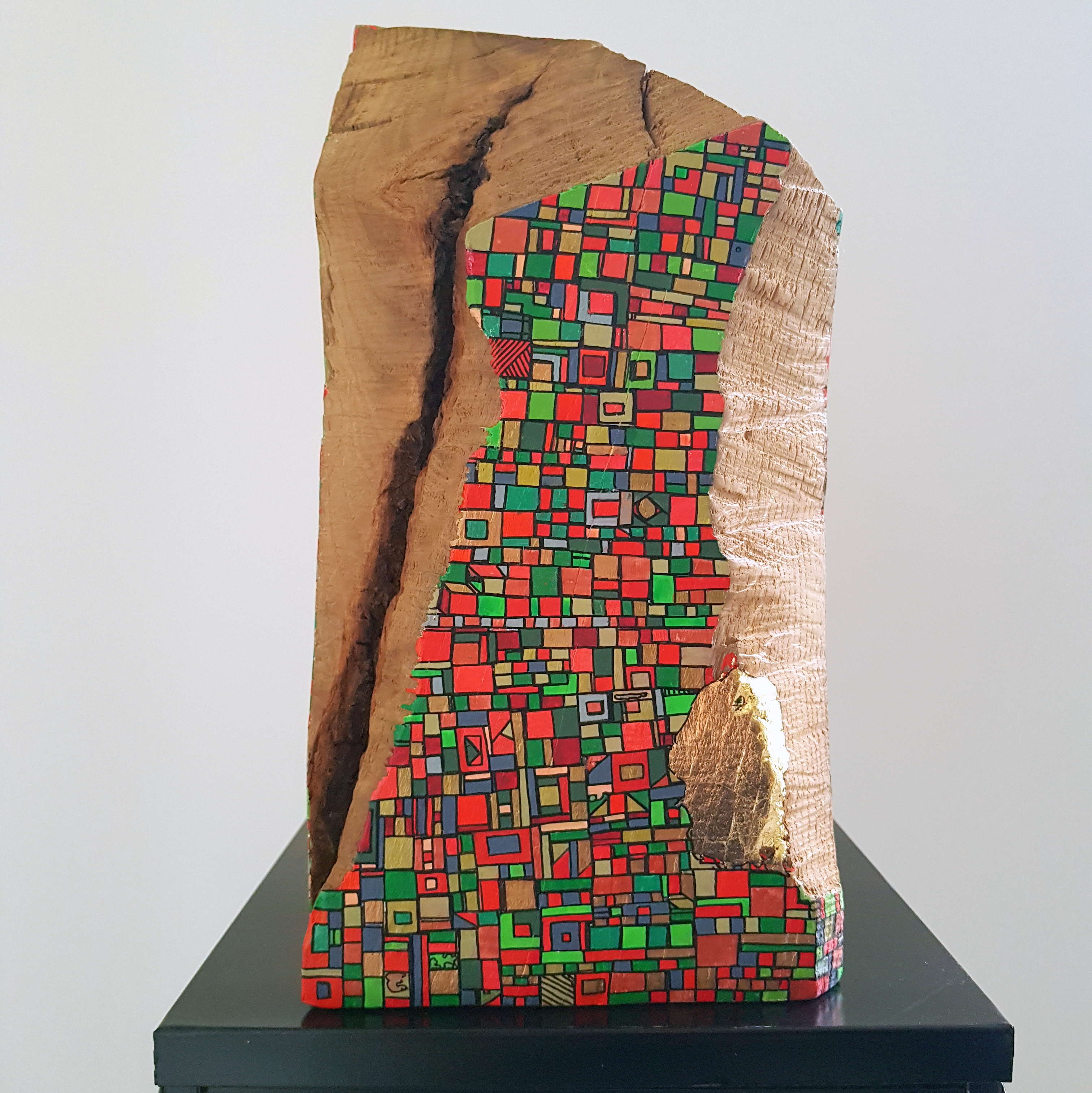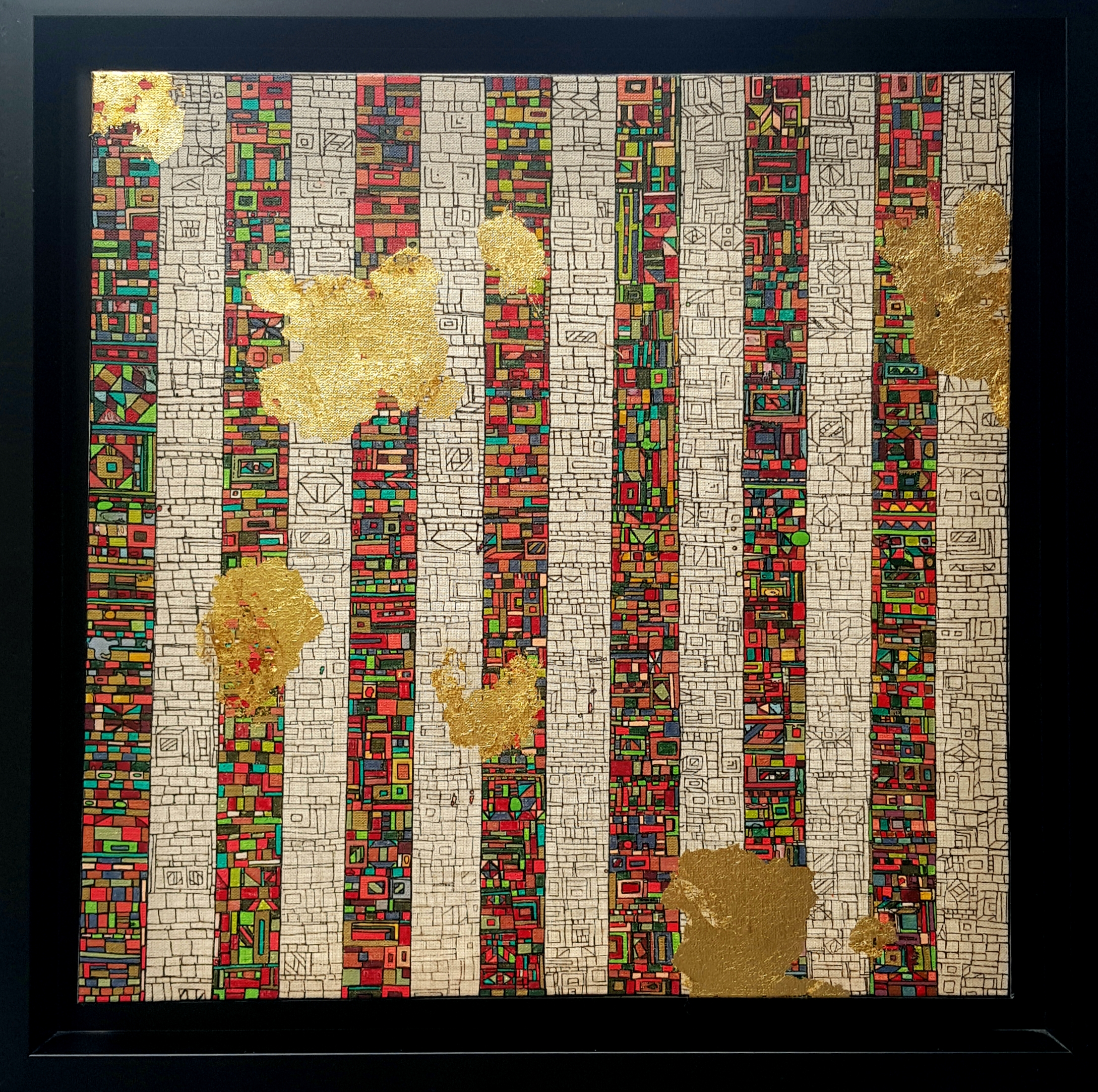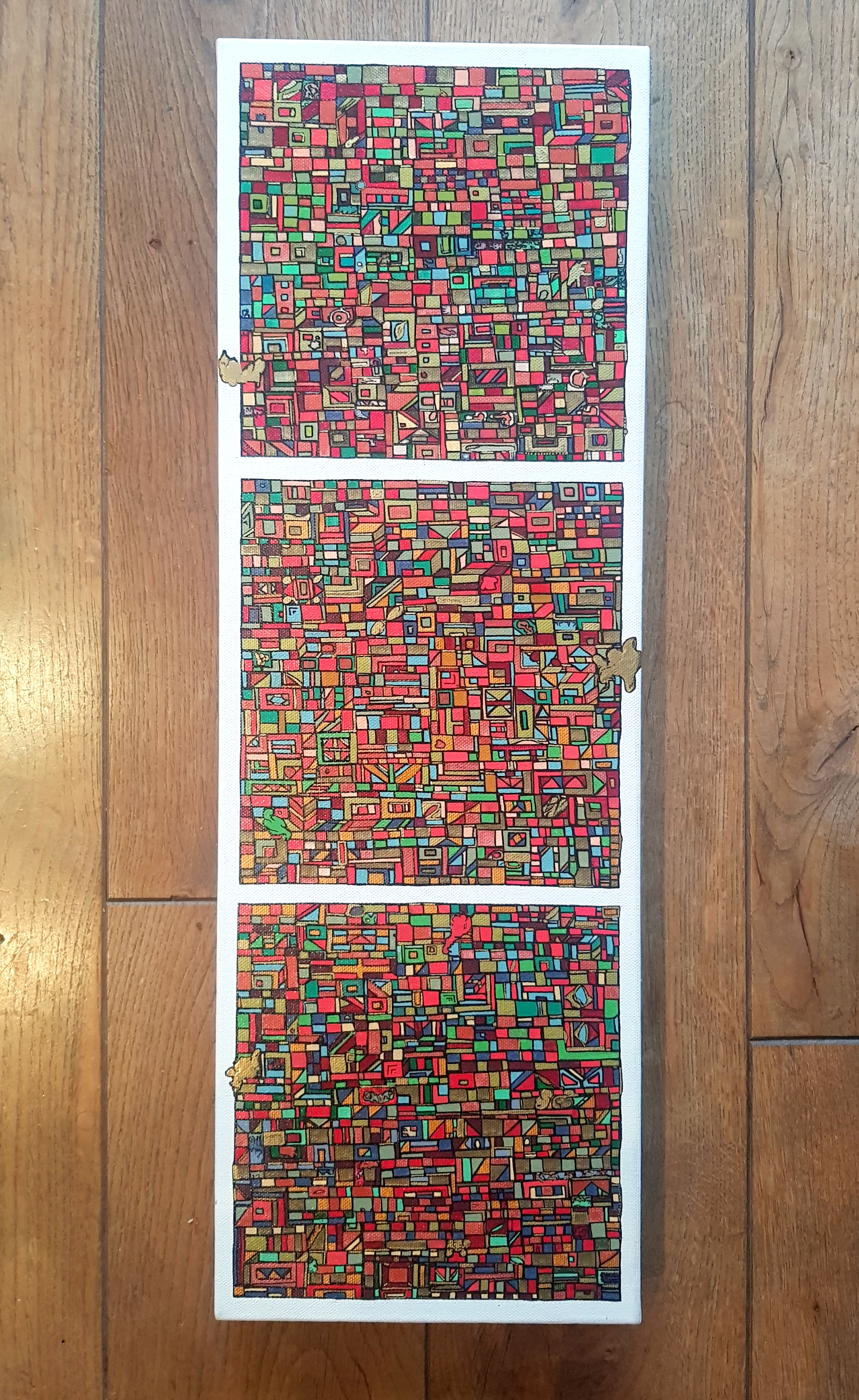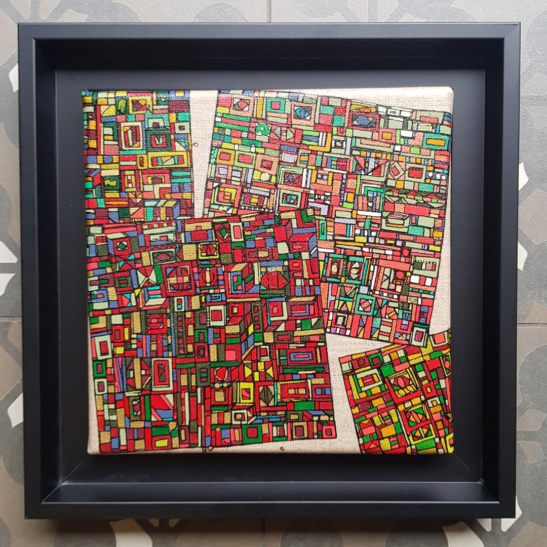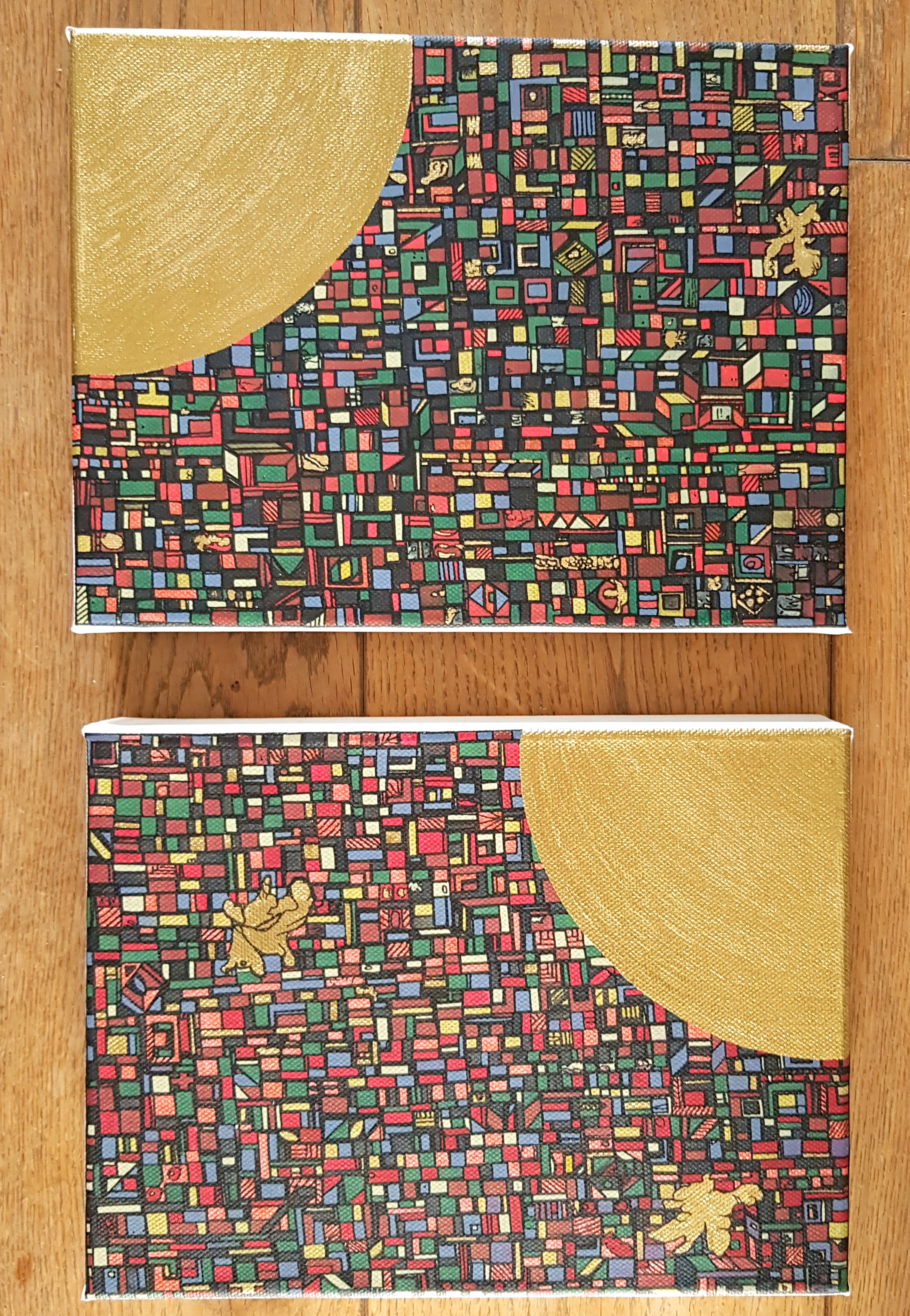 La technique est simple, le plus souvent de l’acrylique accompagné de dorure. Du feutre au pinceau en passant par la feuille d’or sur une toile faite de lin ou quelques fois de coton. Le bois est aussi utilisé, pour les oeuvres en volume, un matériau brut qui sublime la couleur. De petites encres sur papiers en couleurs ou juste tramées de formes aléatoires noires sur fond unis, sont également à découvrir.