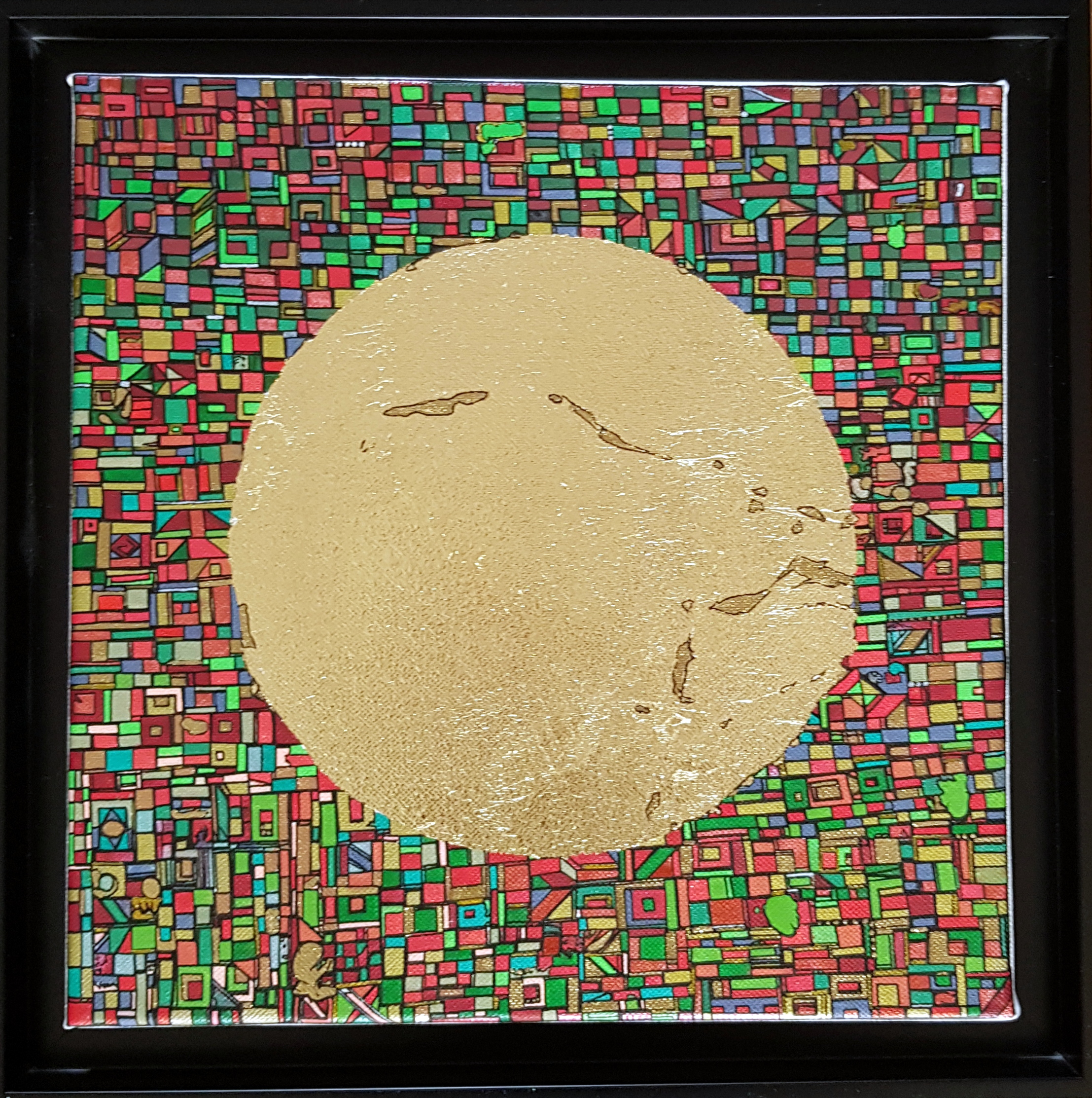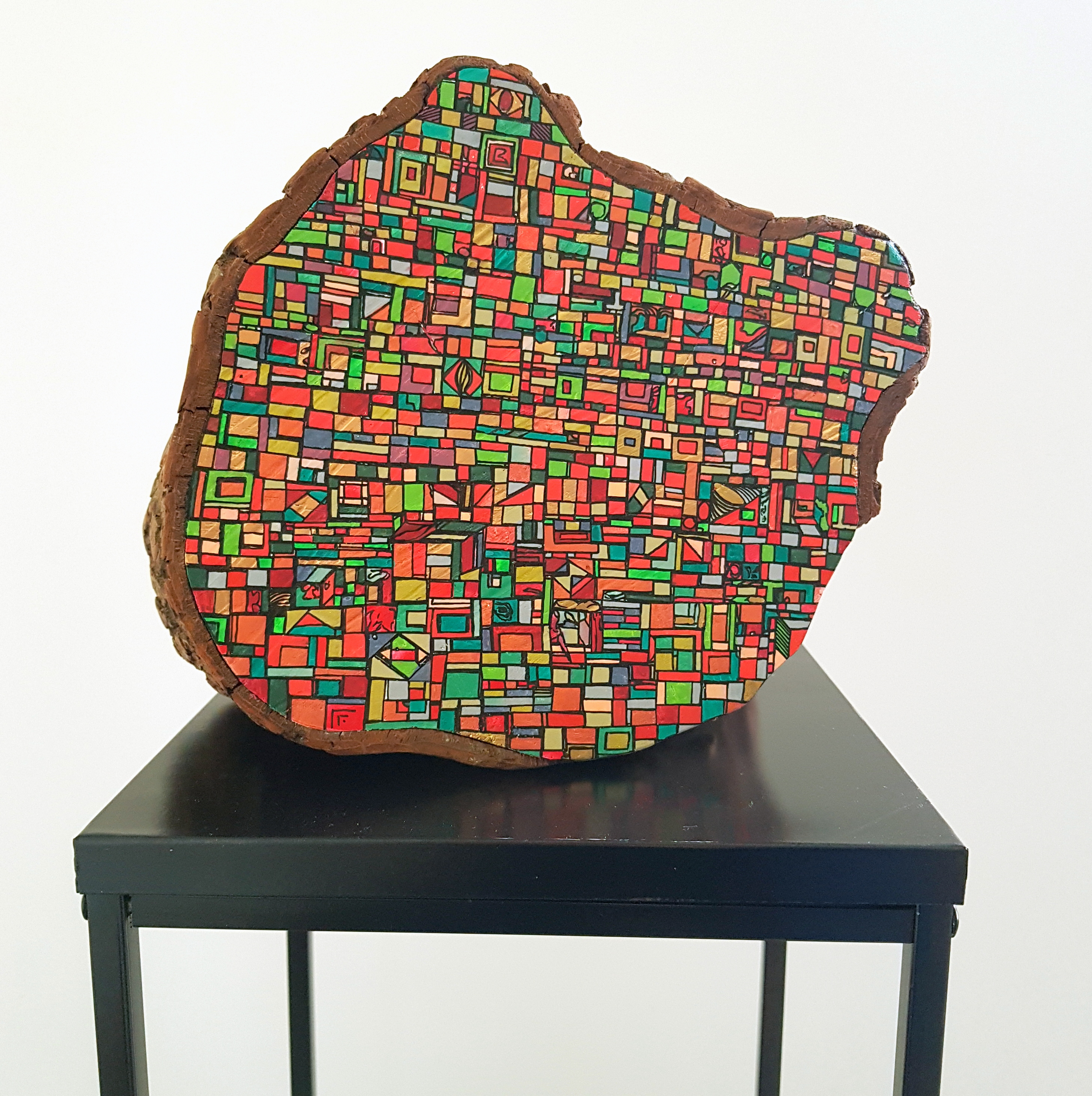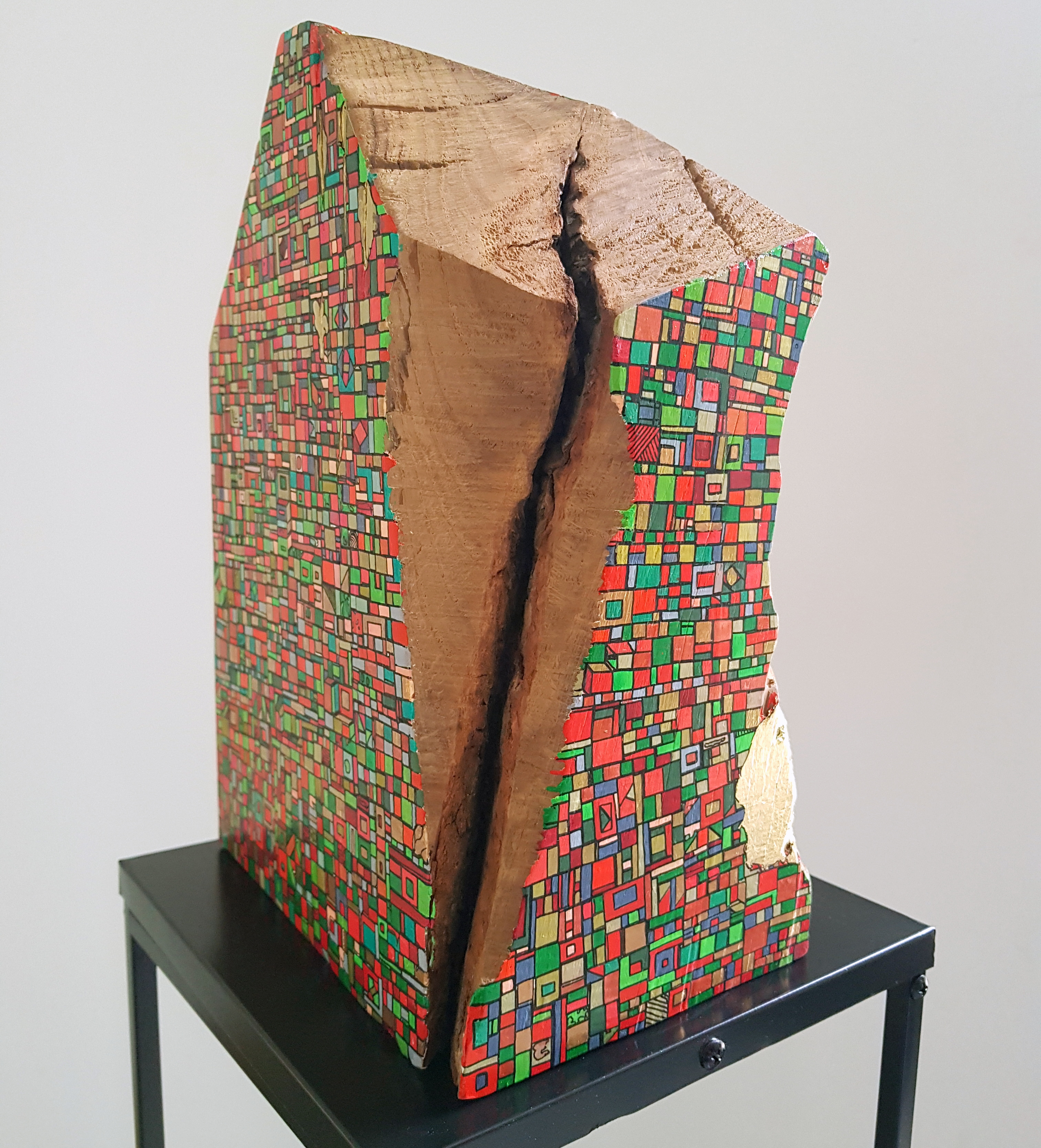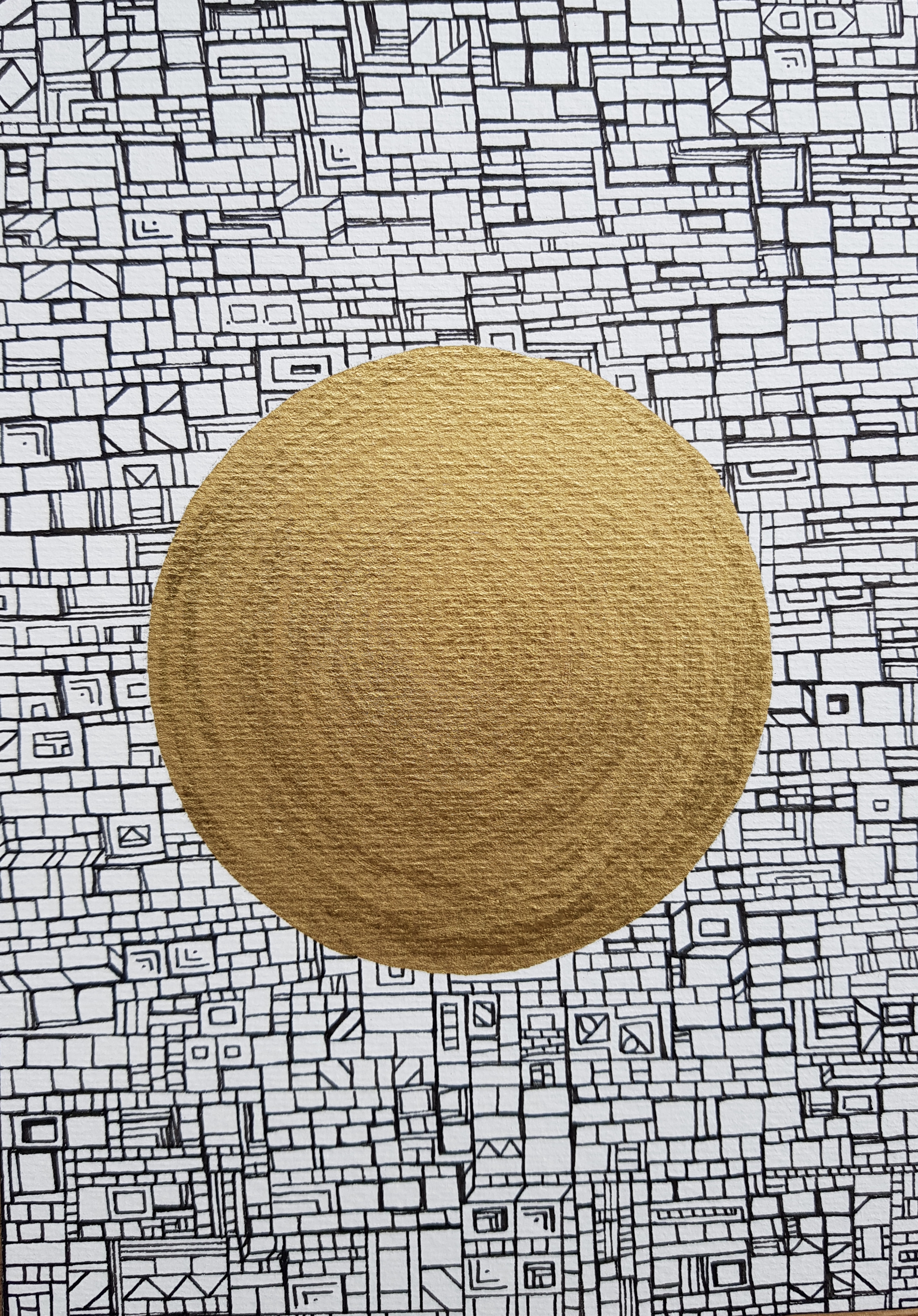 La technique est simple, le plus souvent de l’acrylique accompagné de dorure. Du feutre au pinceau en passant par la feuille d’or sur une toile faite de lin ou quelques fois de coton. Le bois est aussi utilisé, pour les oeuvres en volume, un matériau brut qui sublime la couleur. De petites encres sur papiers en couleurs ou juste tramées de formes aléatoires noires sur fond unis, sont également à découvrir.