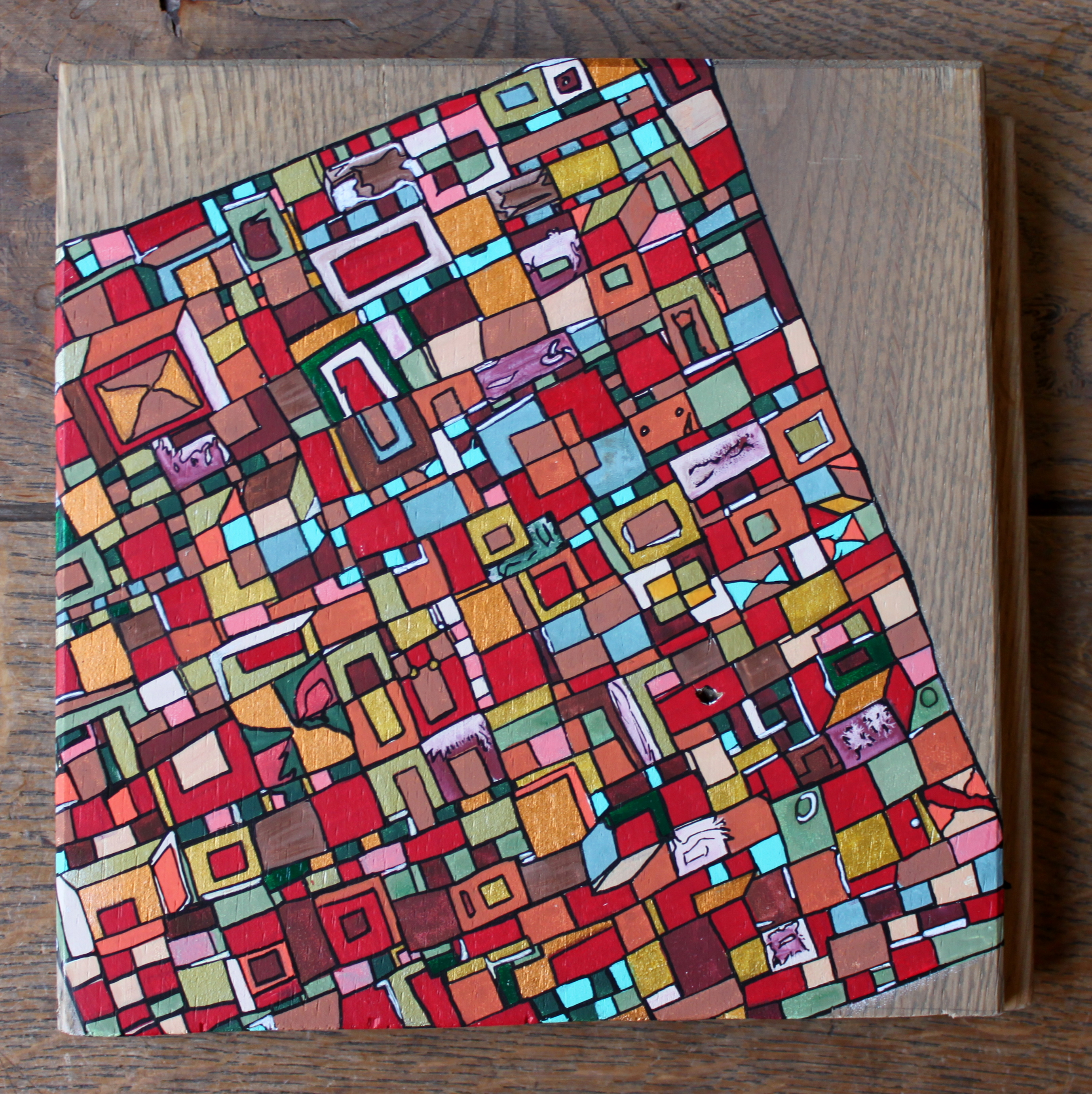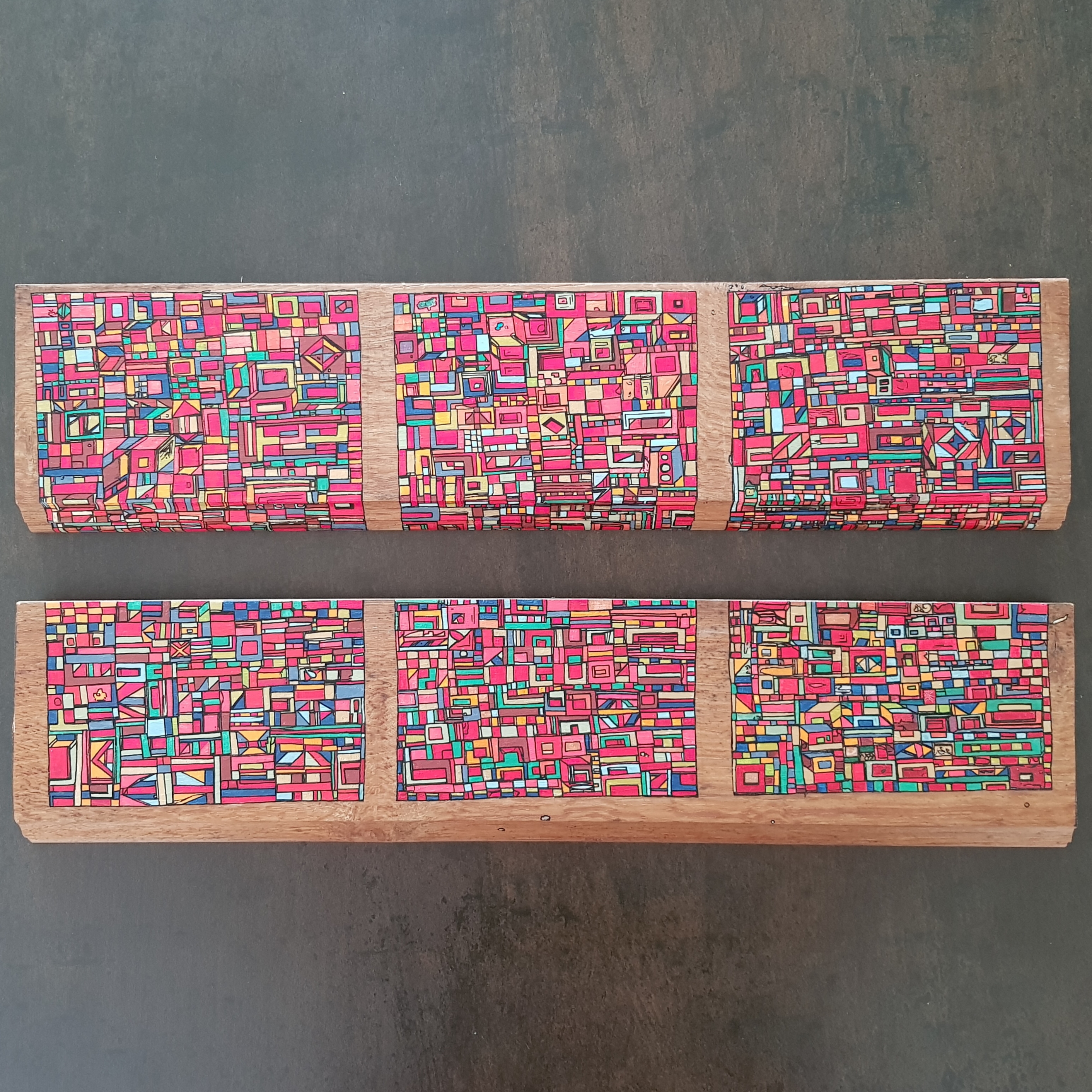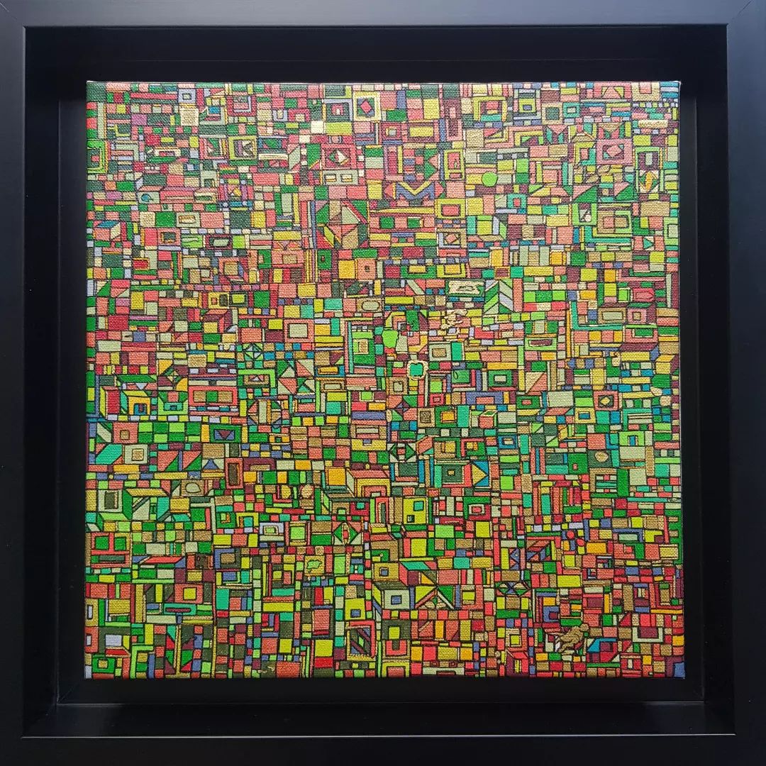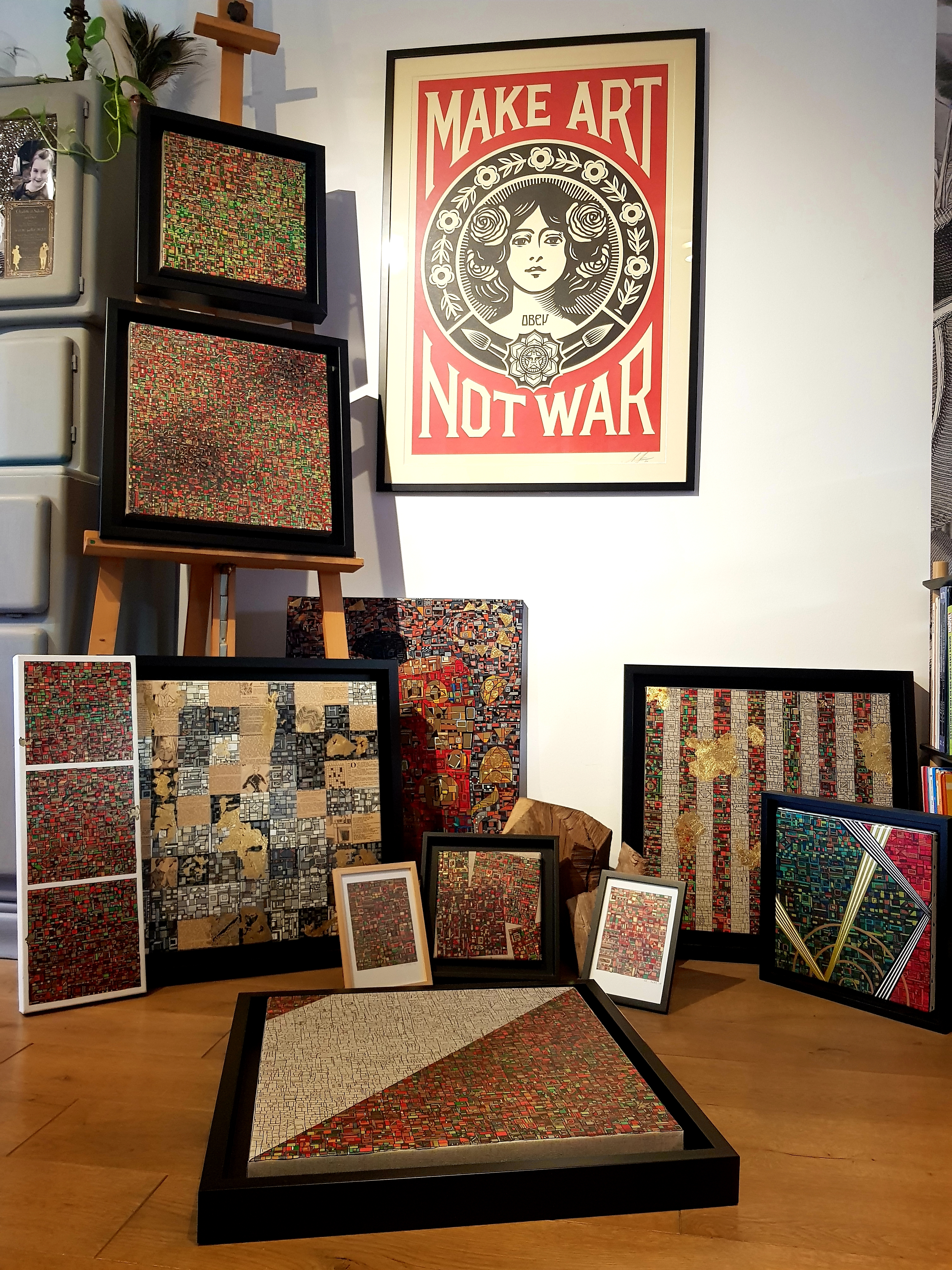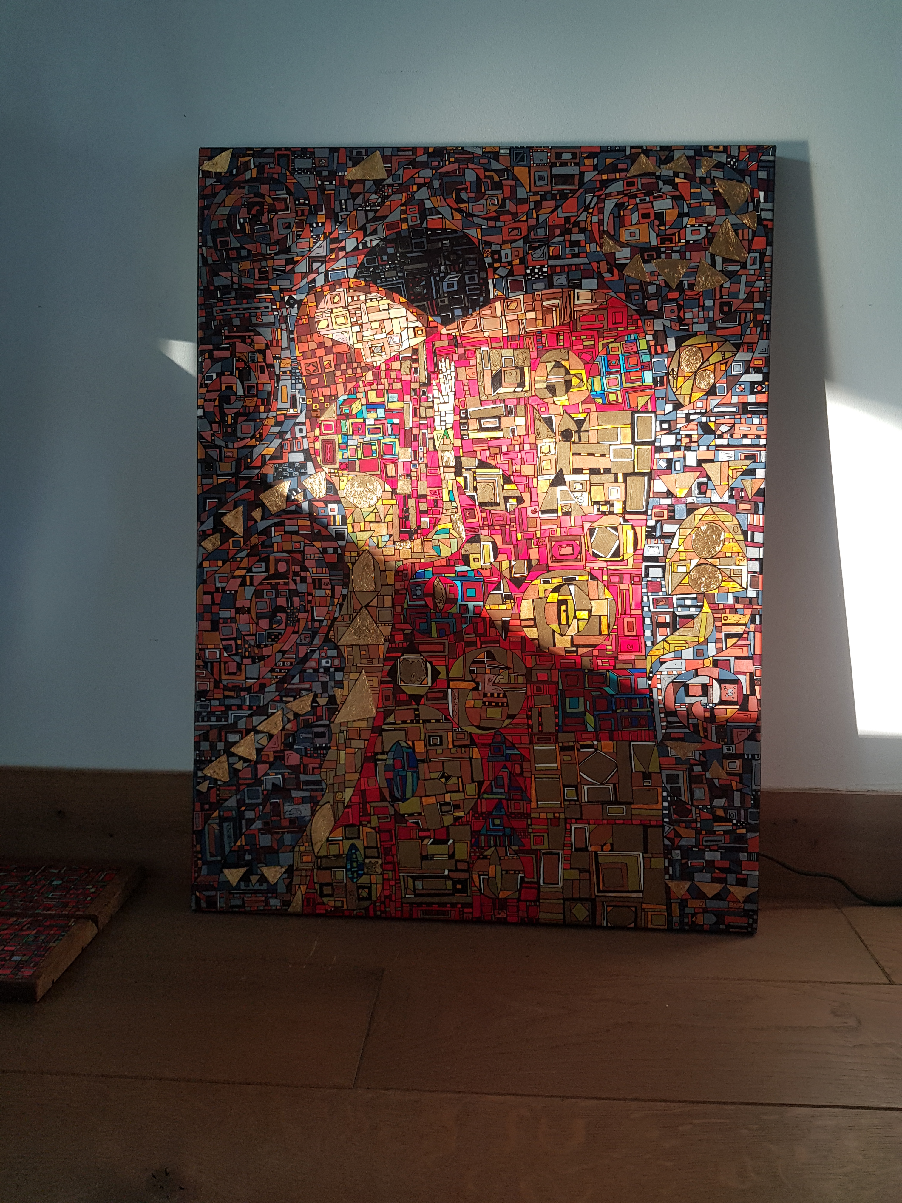 La technique est simple, le plus souvent de l’acrylique accompagné de dorure. Du feutre au pinceau en passant par la feuille d’or sur une toile faite de lin ou quelques fois de coton. Le bois est aussi utilisé, pour les oeuvres en volume, un matériau brut qui sublime la couleur. De petites encres sur papiers en couleurs ou juste tramées de formes aléatoires noires sur fond unis, sont également à découvrir.