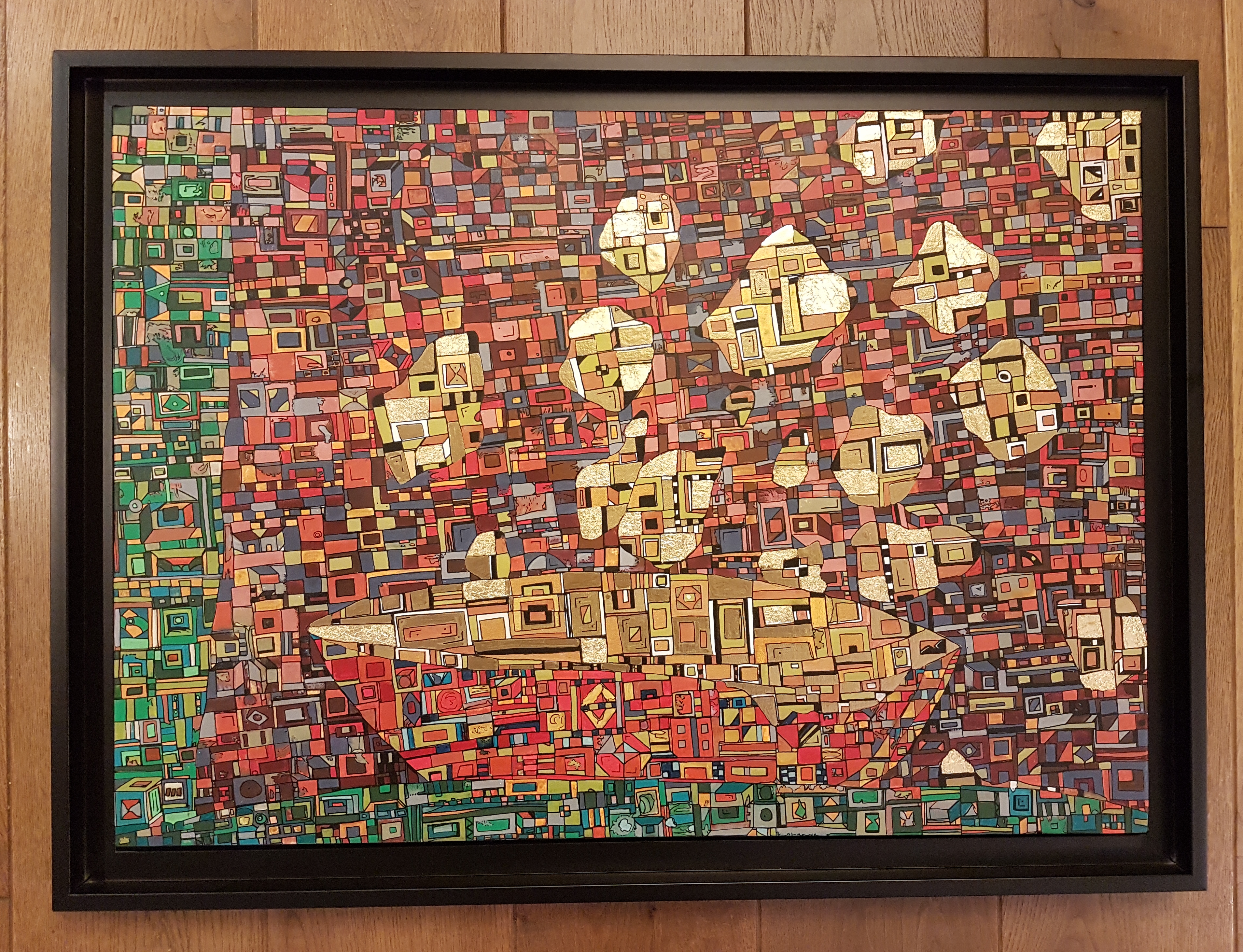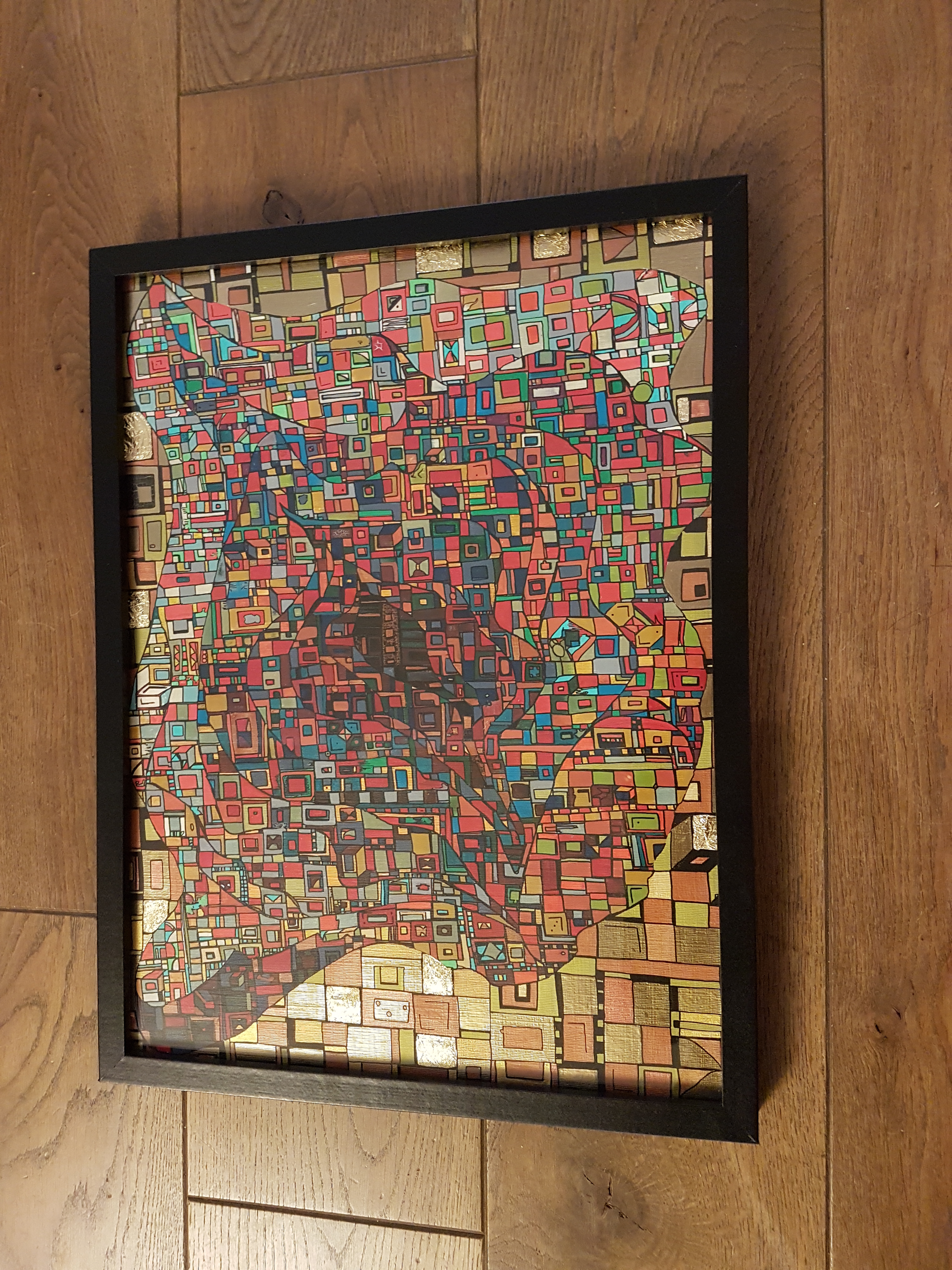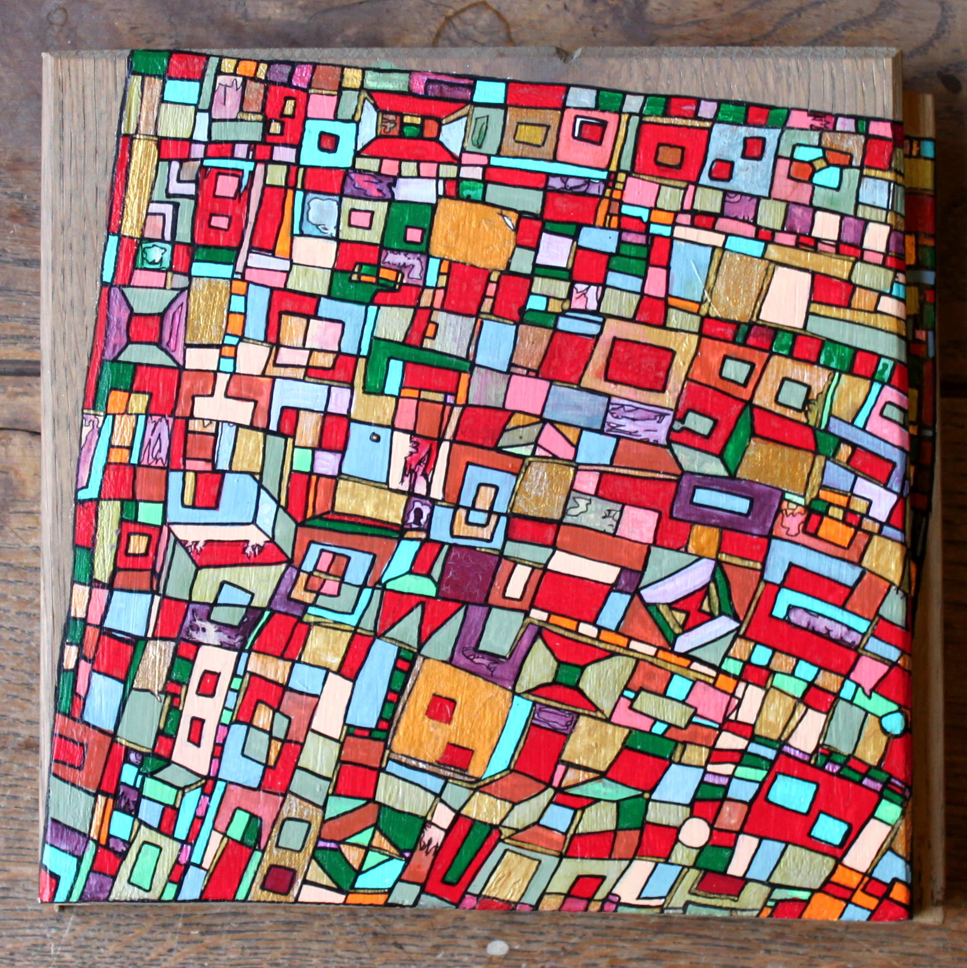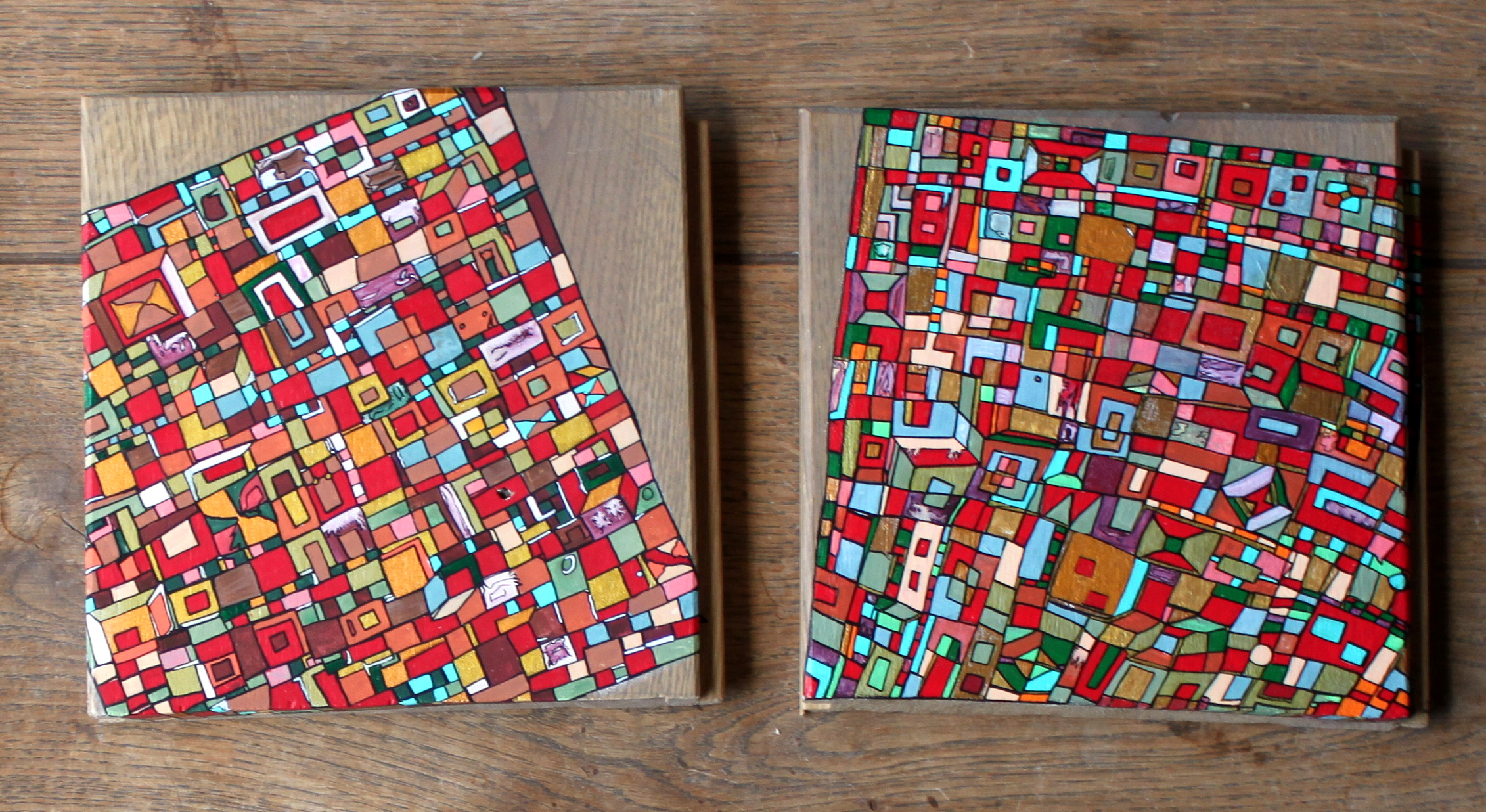 La technique est simple, le plus souvent de l’acrylique accompagné de dorure. Du feutre au pinceau en passant par la feuille d’or sur une toile faite de lin ou quelques fois de coton. Le bois est aussi utilisé, pour les oeuvres en volume, un matériau brut qui sublime la couleur. De petites encres sur papiers en couleurs ou juste tramées de formes aléatoires noires sur fond unis, sont également à découvrir.