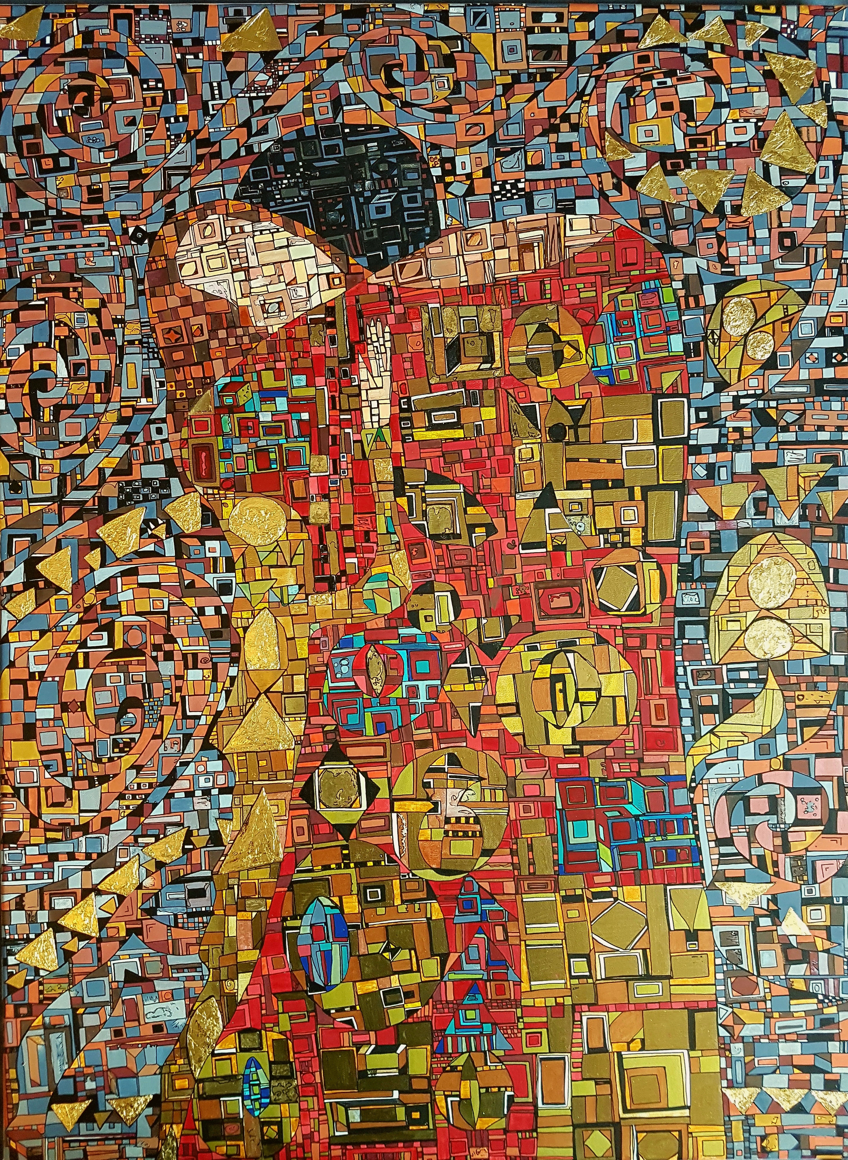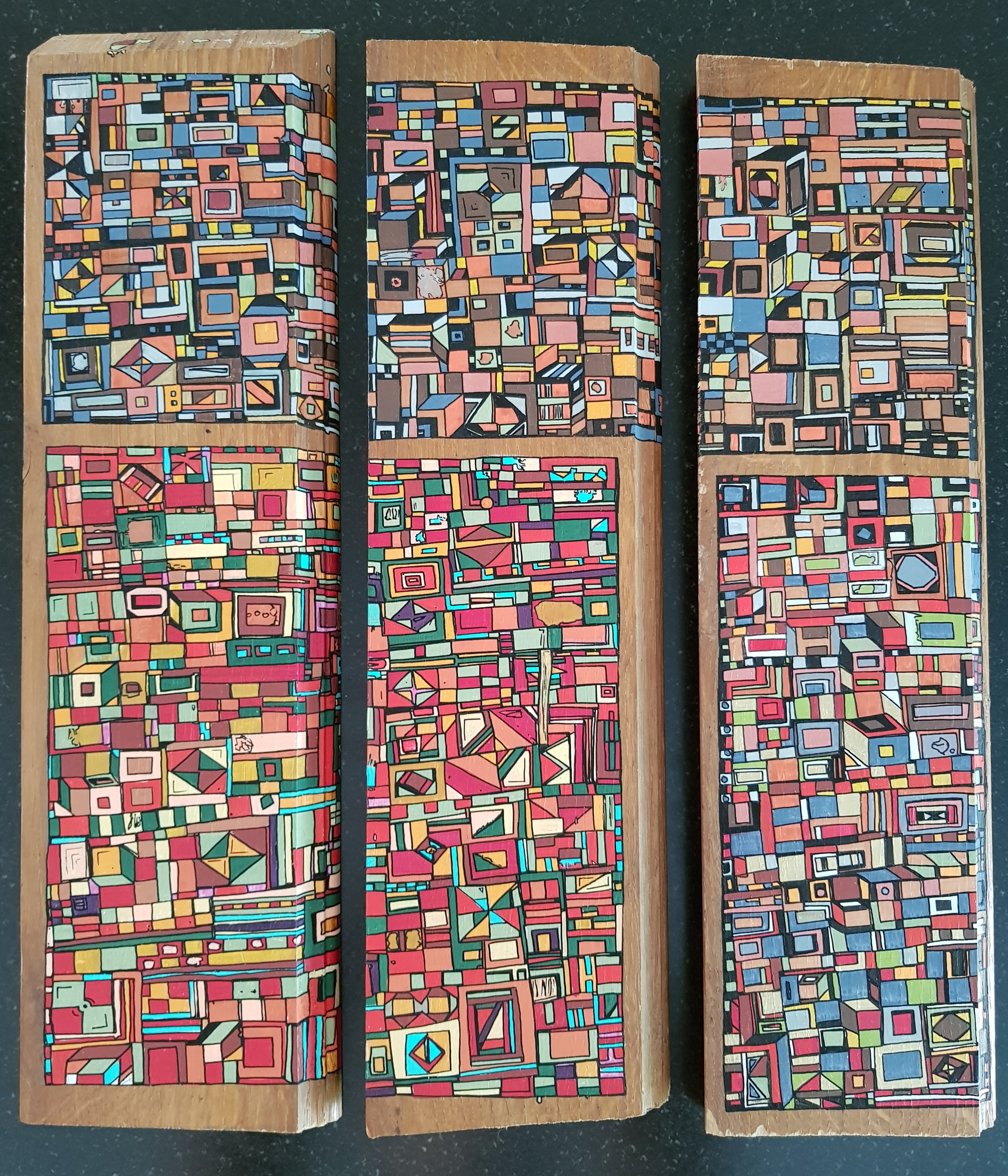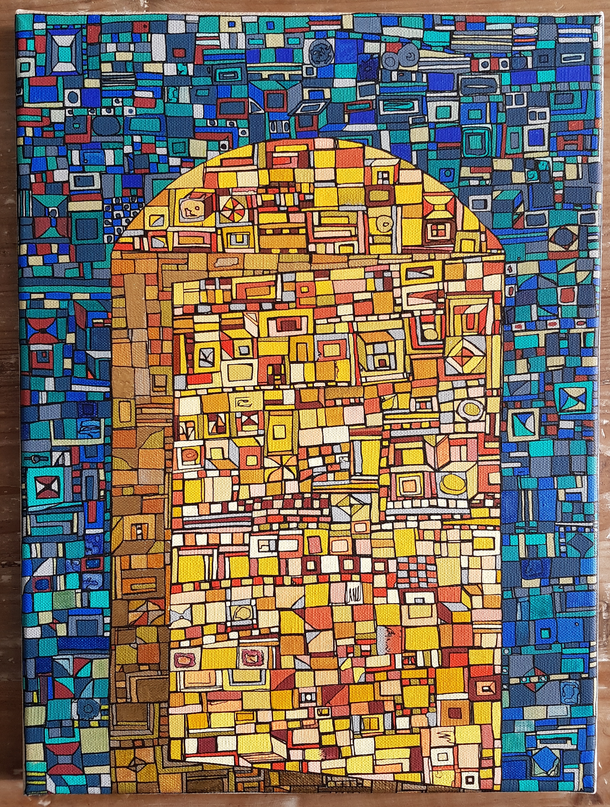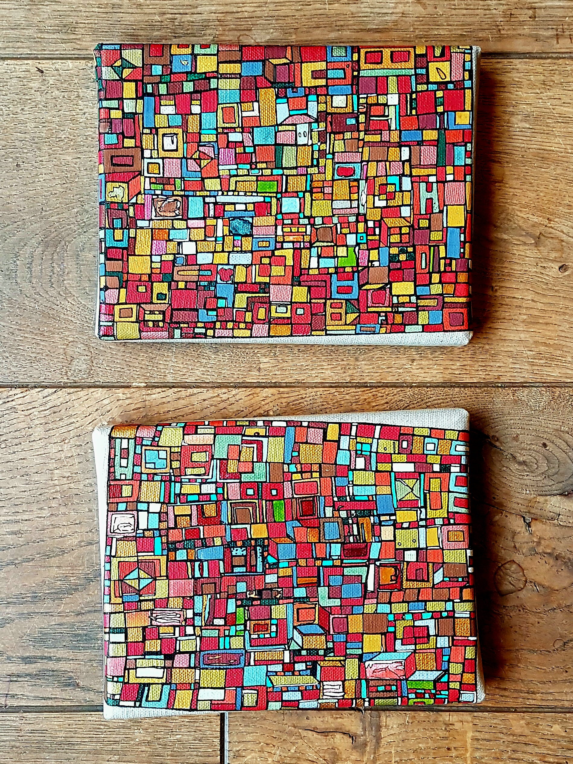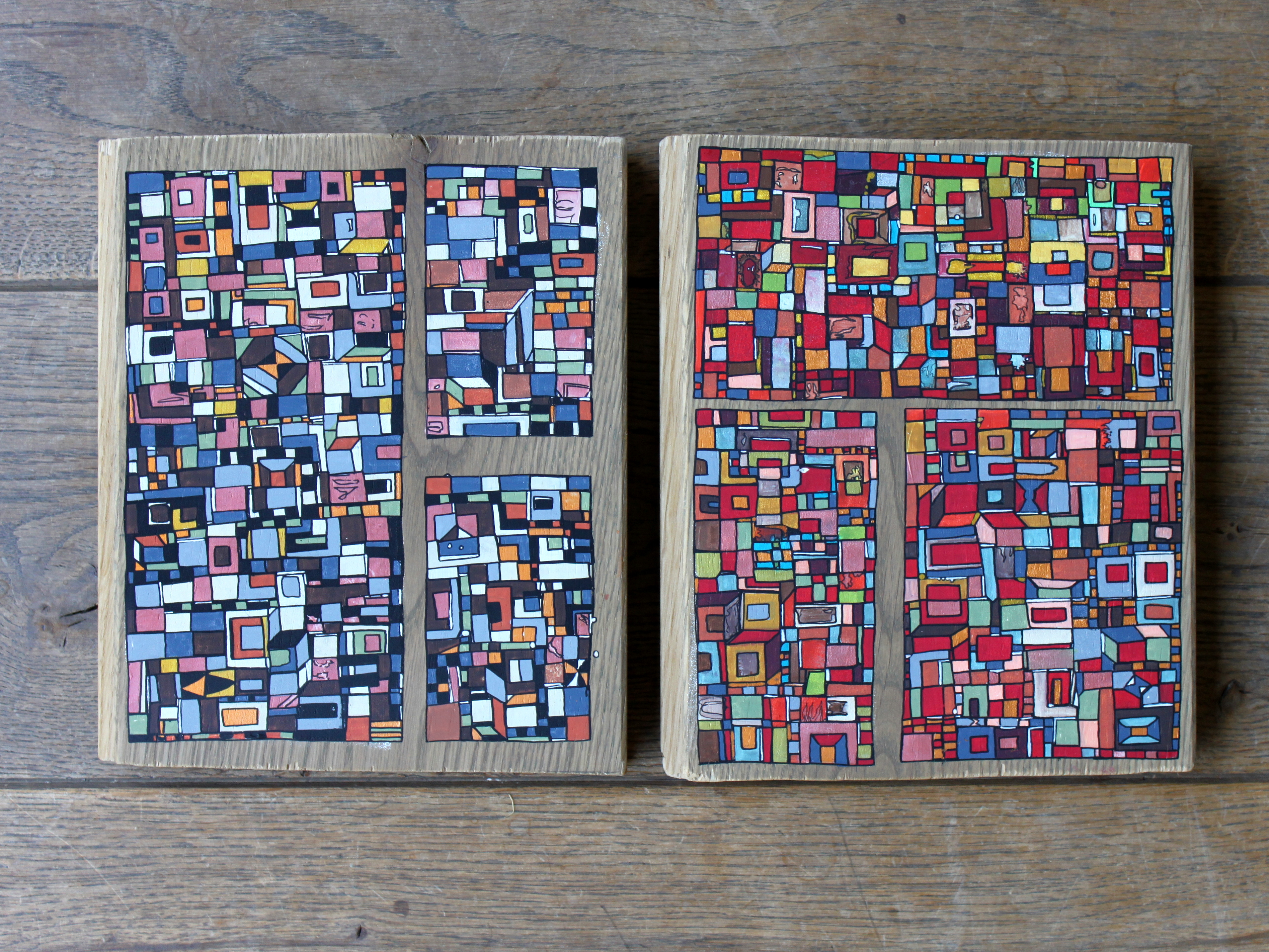 La technique est simple, le plus souvent de l’acrylique accompagné de dorure. Du feutre au pinceau en passant par la feuille d’or sur une toile faite de lin ou quelques fois de coton. Le bois est aussi utilisé, pour les oeuvres en volume, un matériau brut qui sublime la couleur. De petites encres sur papiers en couleurs ou juste tramées de formes aléatoires noires sur fond unis, sont également à découvrir.