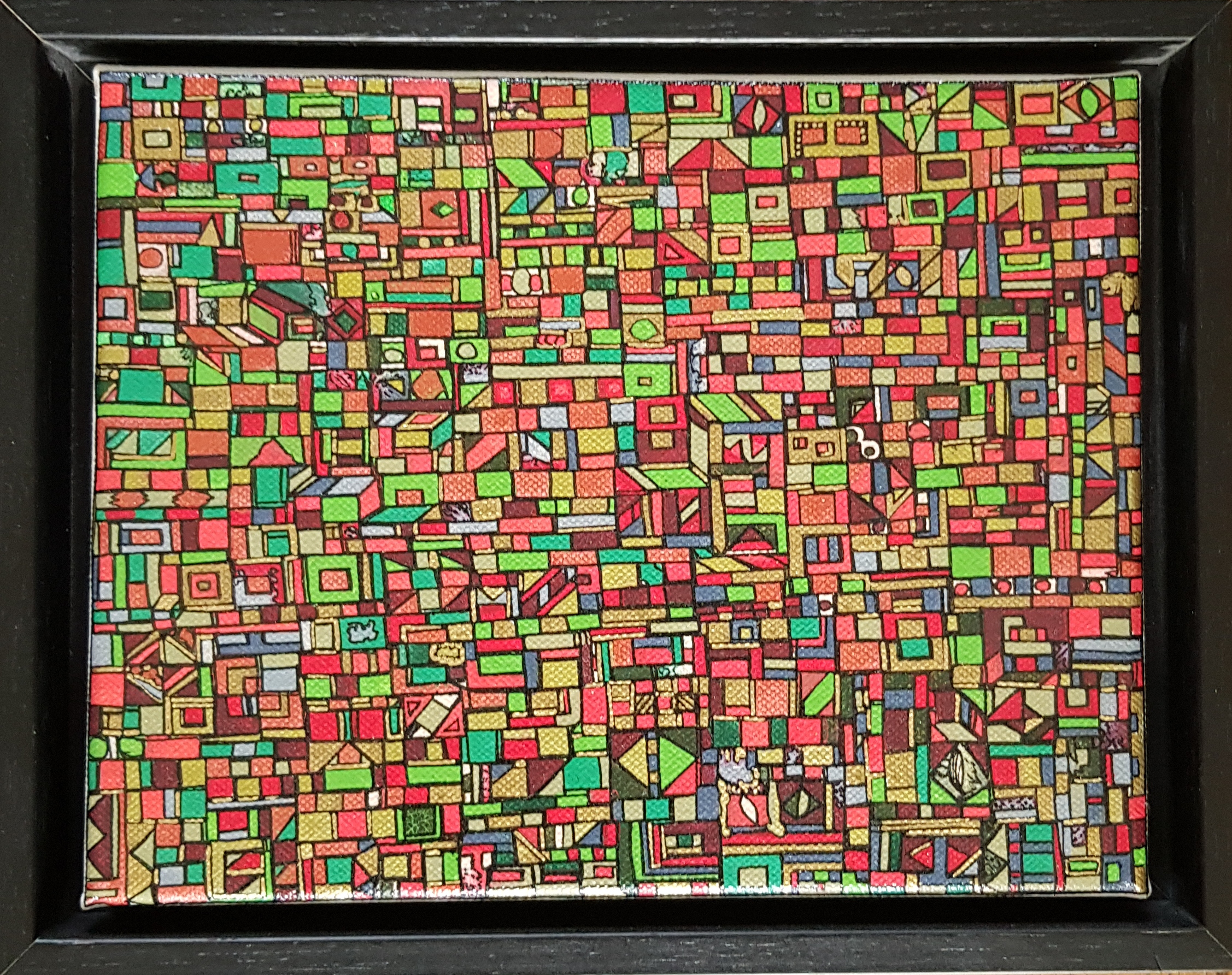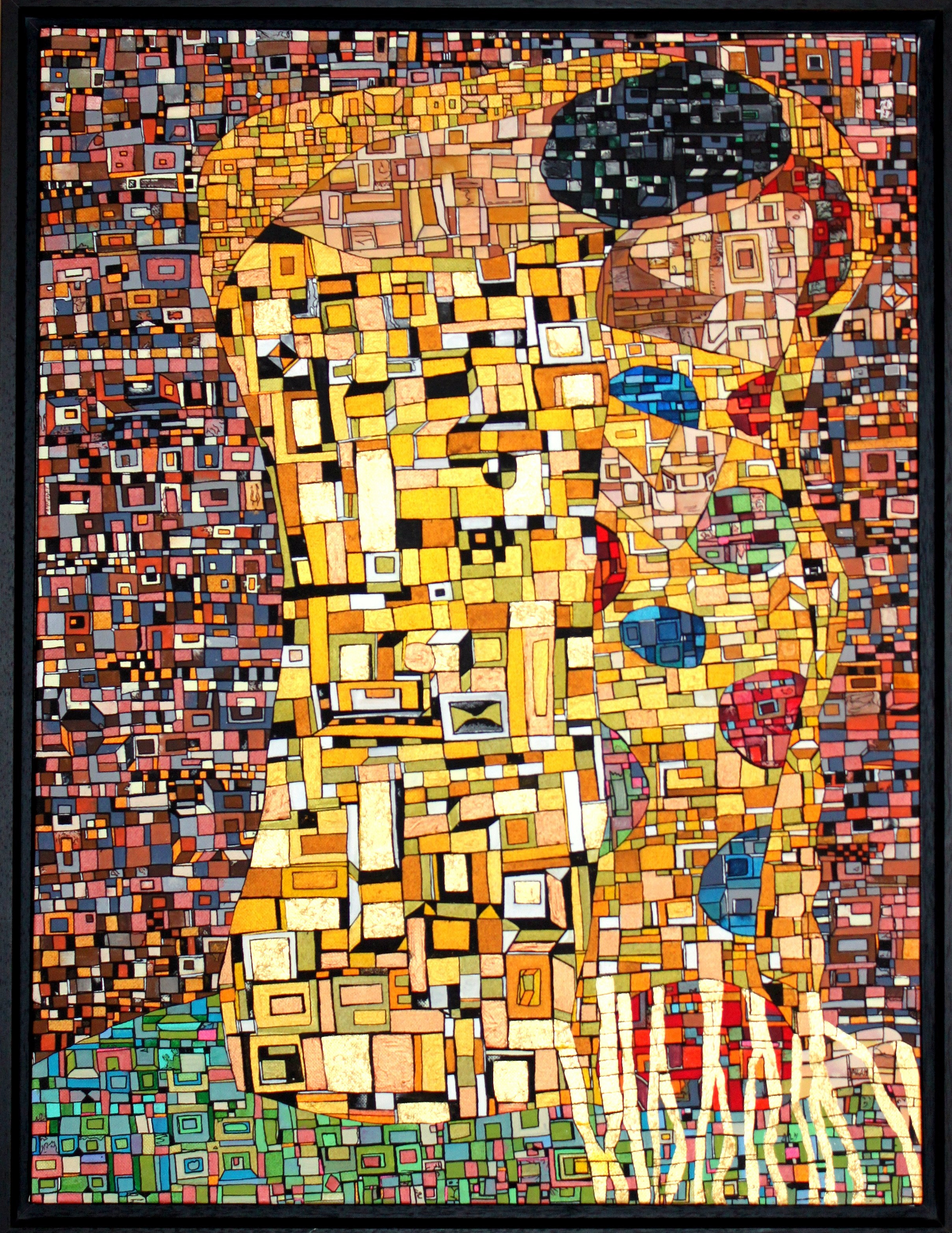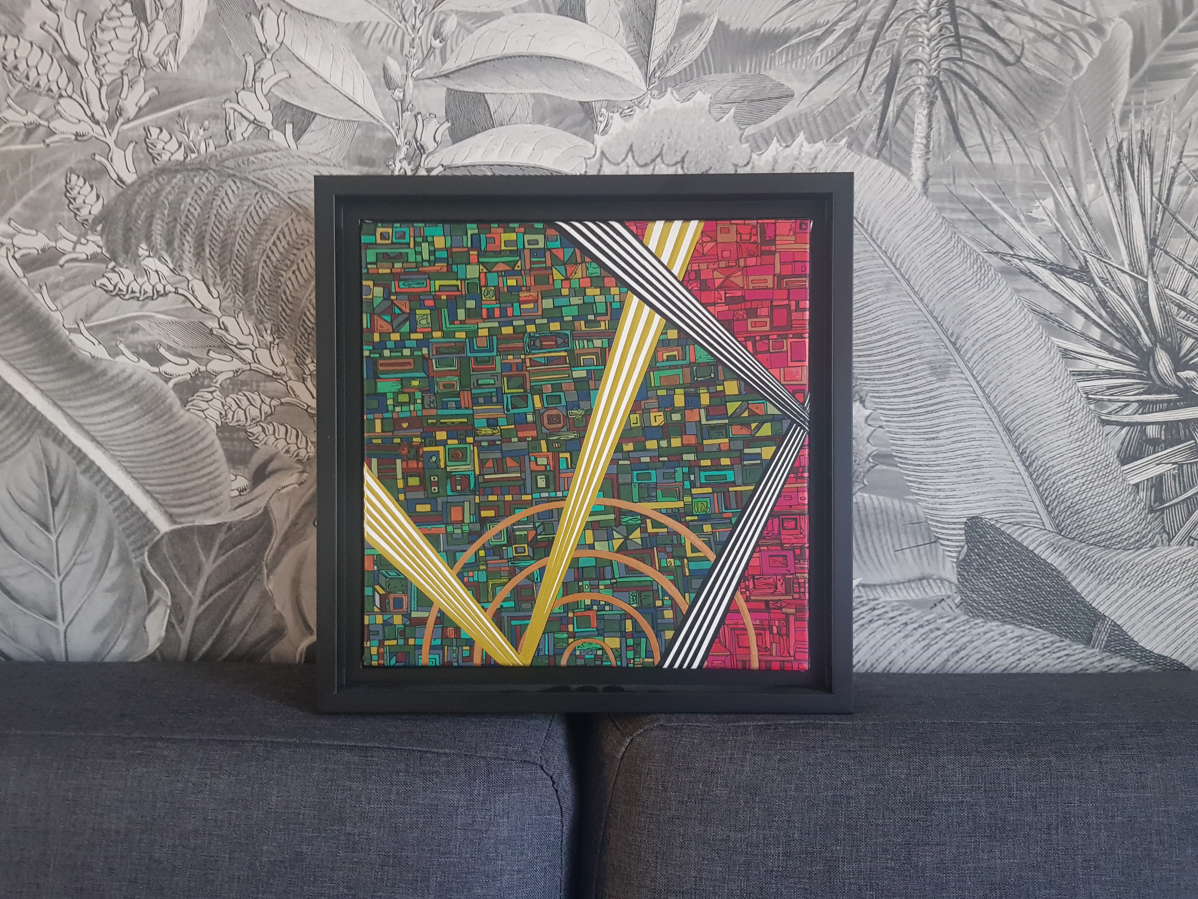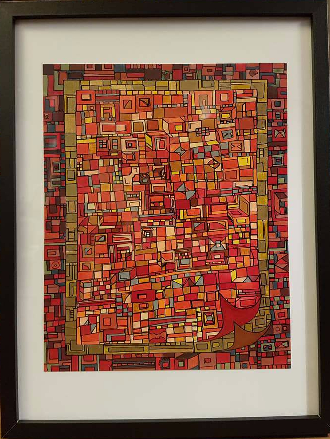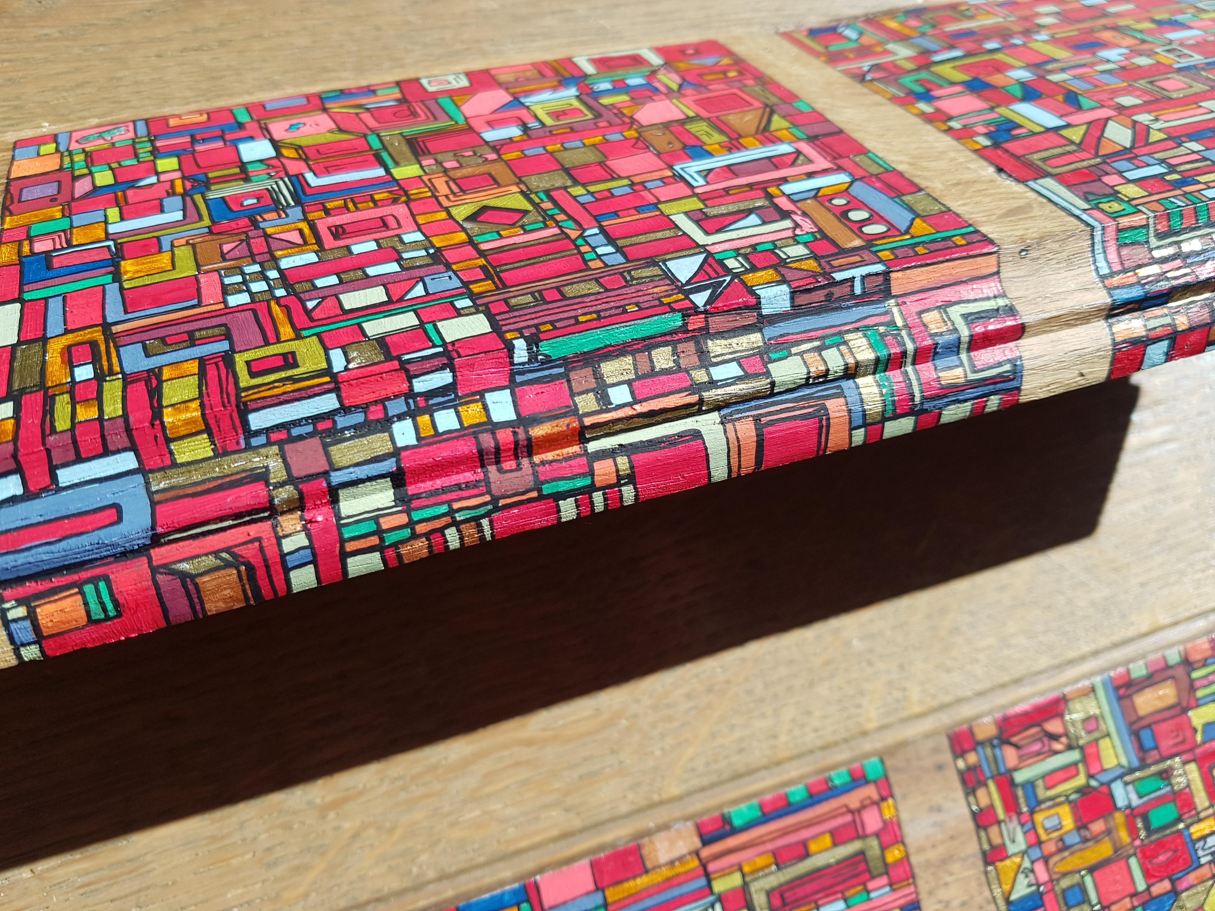La technique est simple, le plus souvent de l’acrylique accompagné de dorure. Du feutre au pinceau en passant par la feuille d’or sur une toile faite de lin ou quelques fois de coton. Le bois est aussi utilisé, pour les oeuvres en volume, un matériau brut qui sublime la couleur. De petites encres sur papiers en couleurs ou juste tramées de formes aléatoires noires sur fond unis, sont également à découvrir.