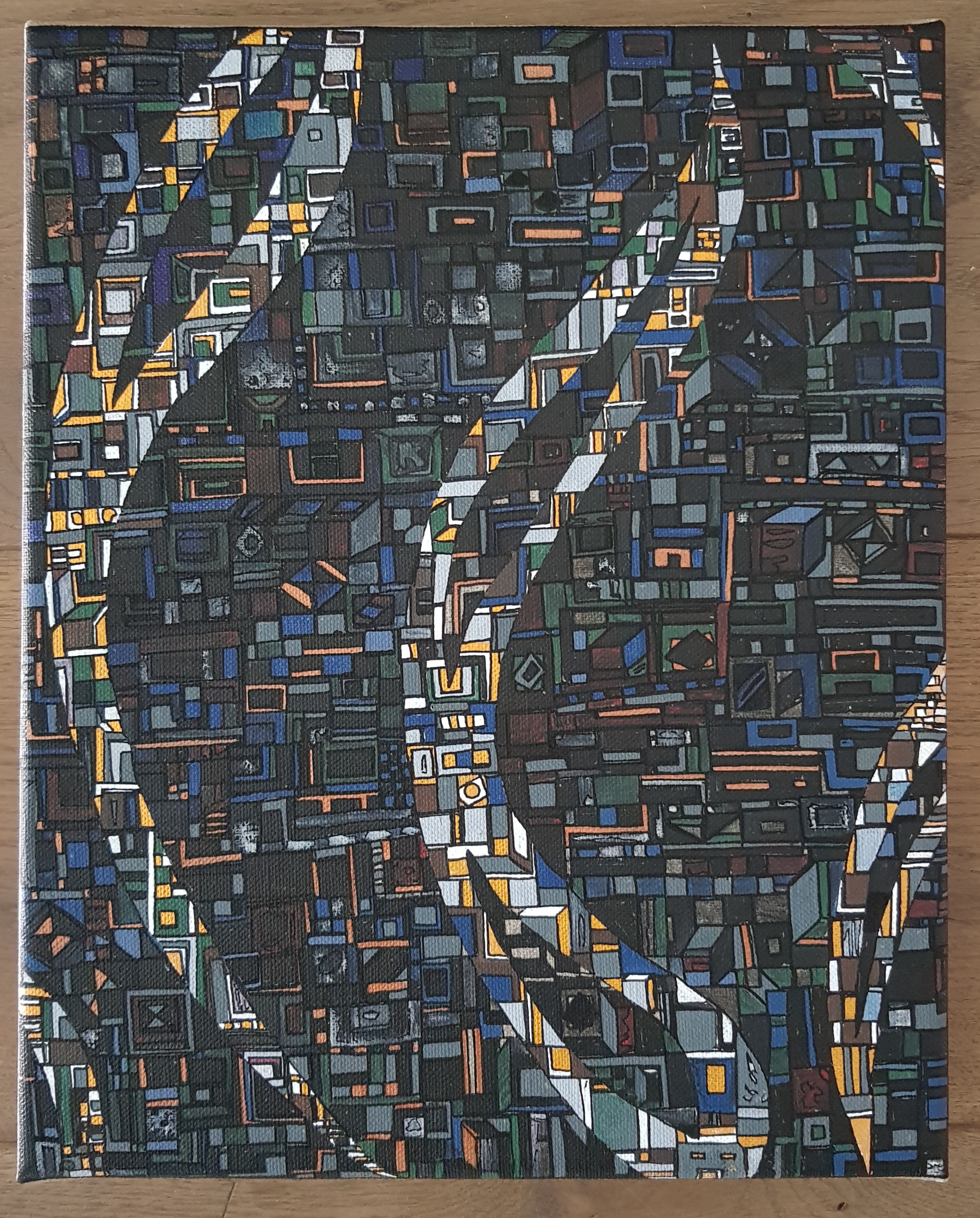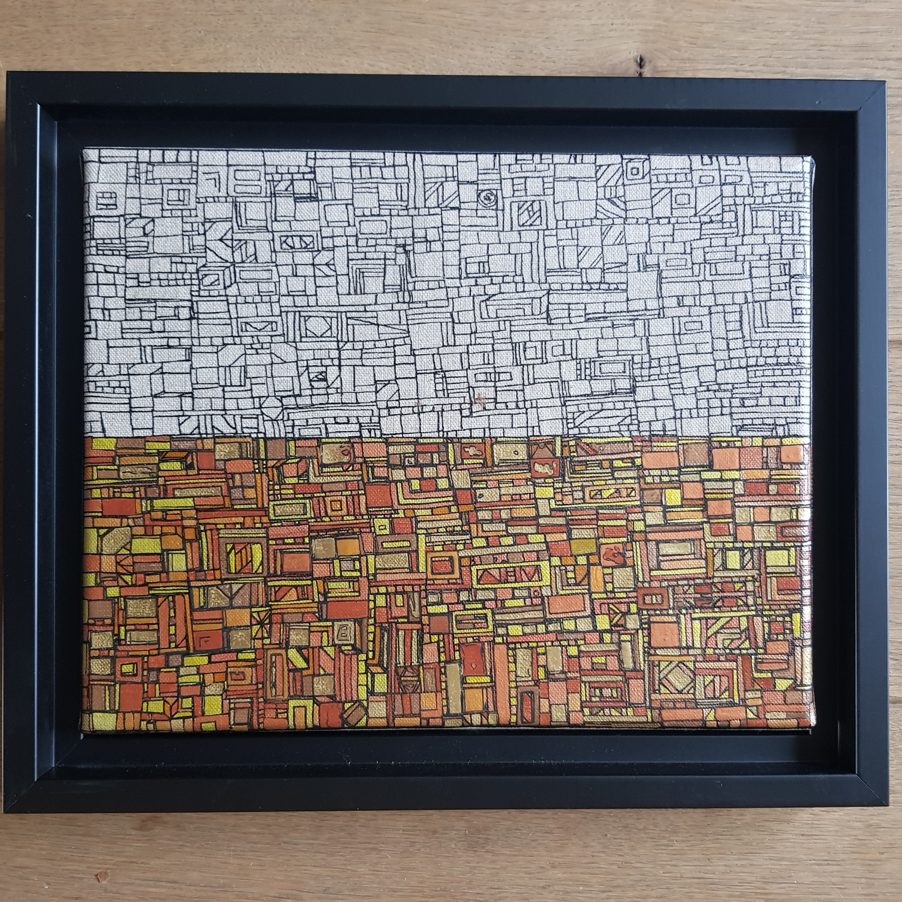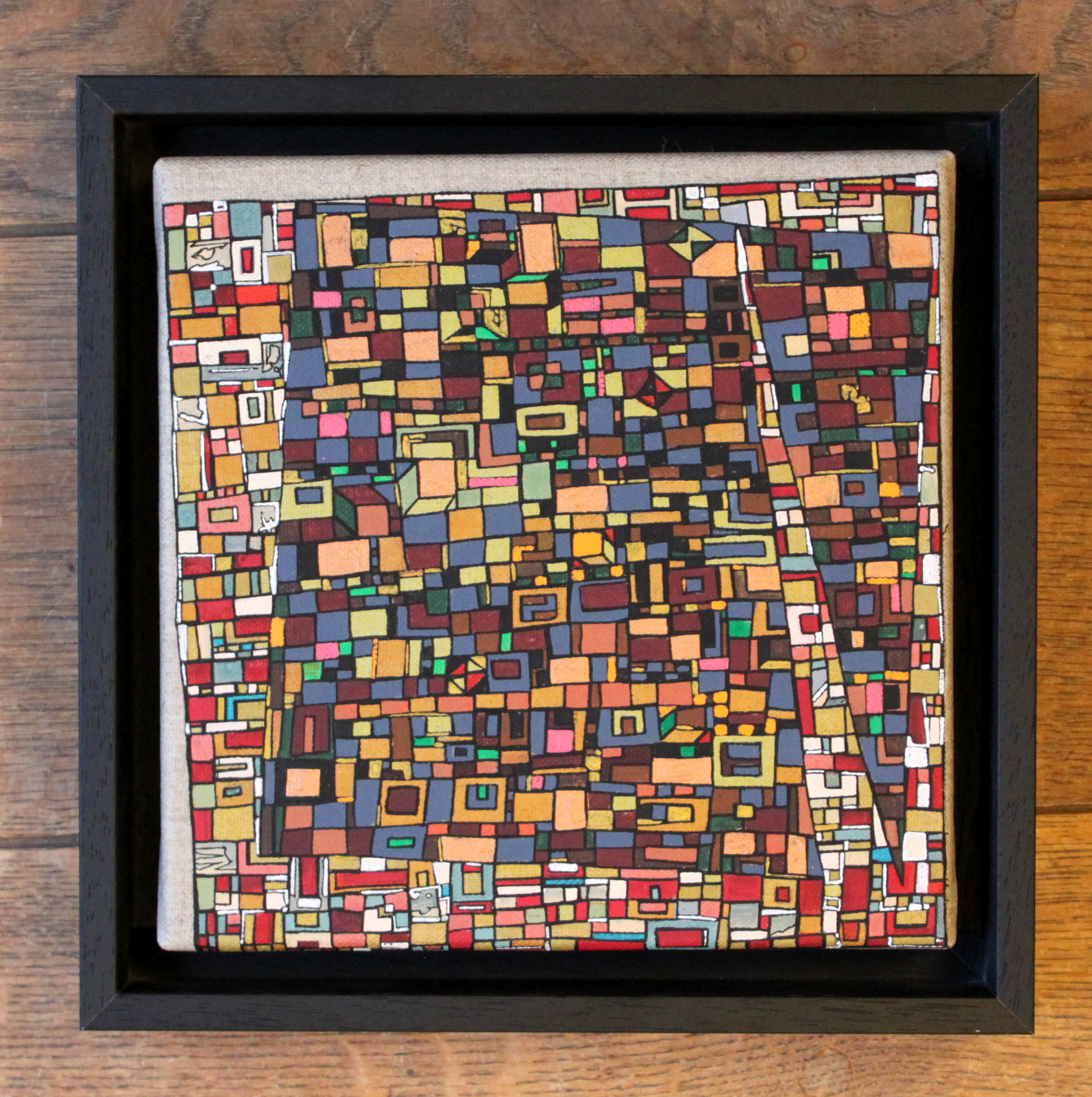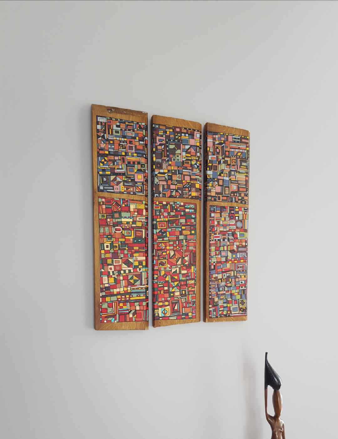 La technique est simple, le plus souvent de l’acrylique accompagné de dorure. Du feutre au pinceau en passant par la feuille d’or sur une toile faite de lin ou quelques fois de coton. Le bois est aussi utilisé, pour les oeuvres en volume, un matériau brut qui sublime la couleur. De petites encres sur papiers en couleurs ou juste tramées de formes aléatoires noires sur fond unis, sont également à découvrir.