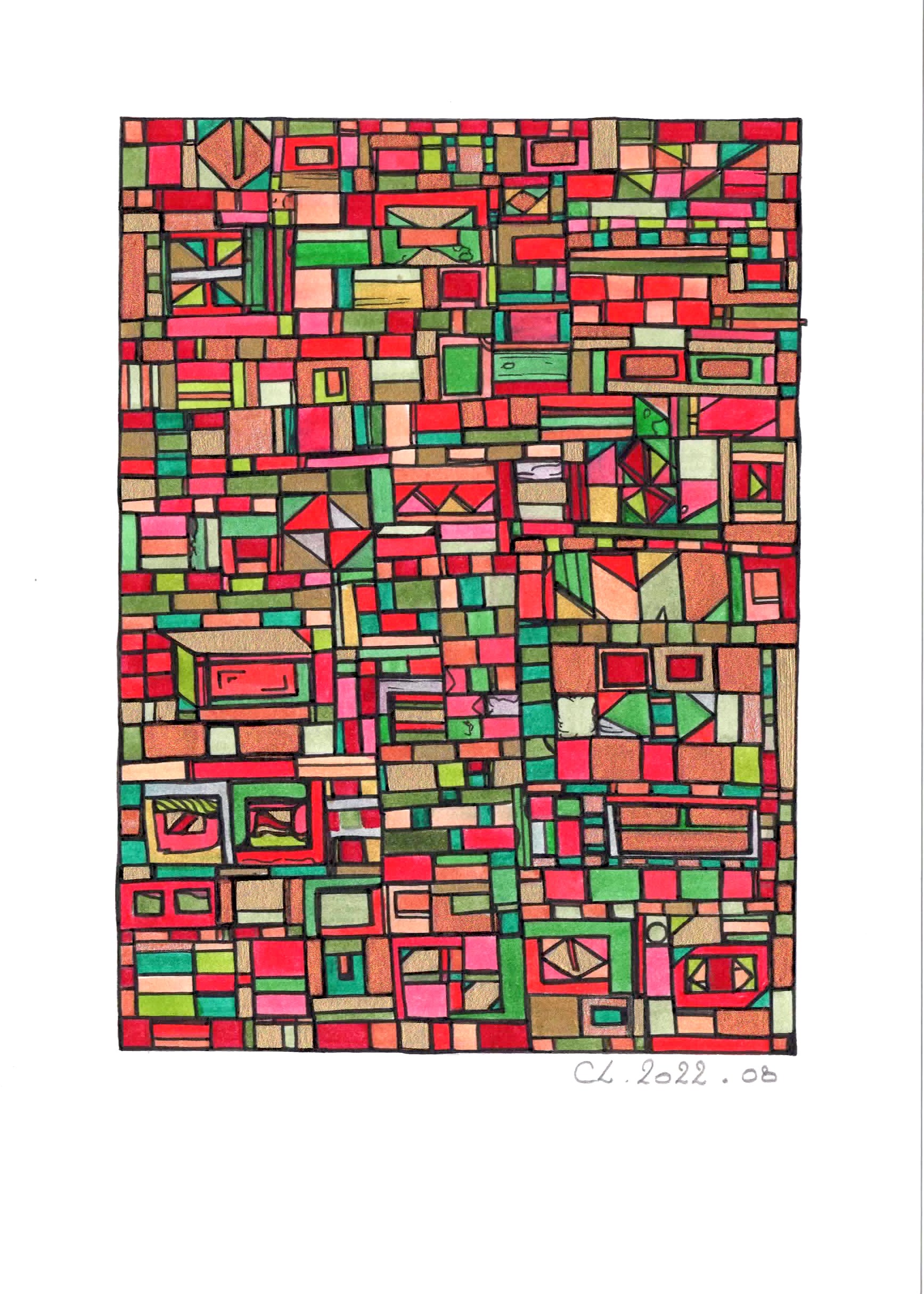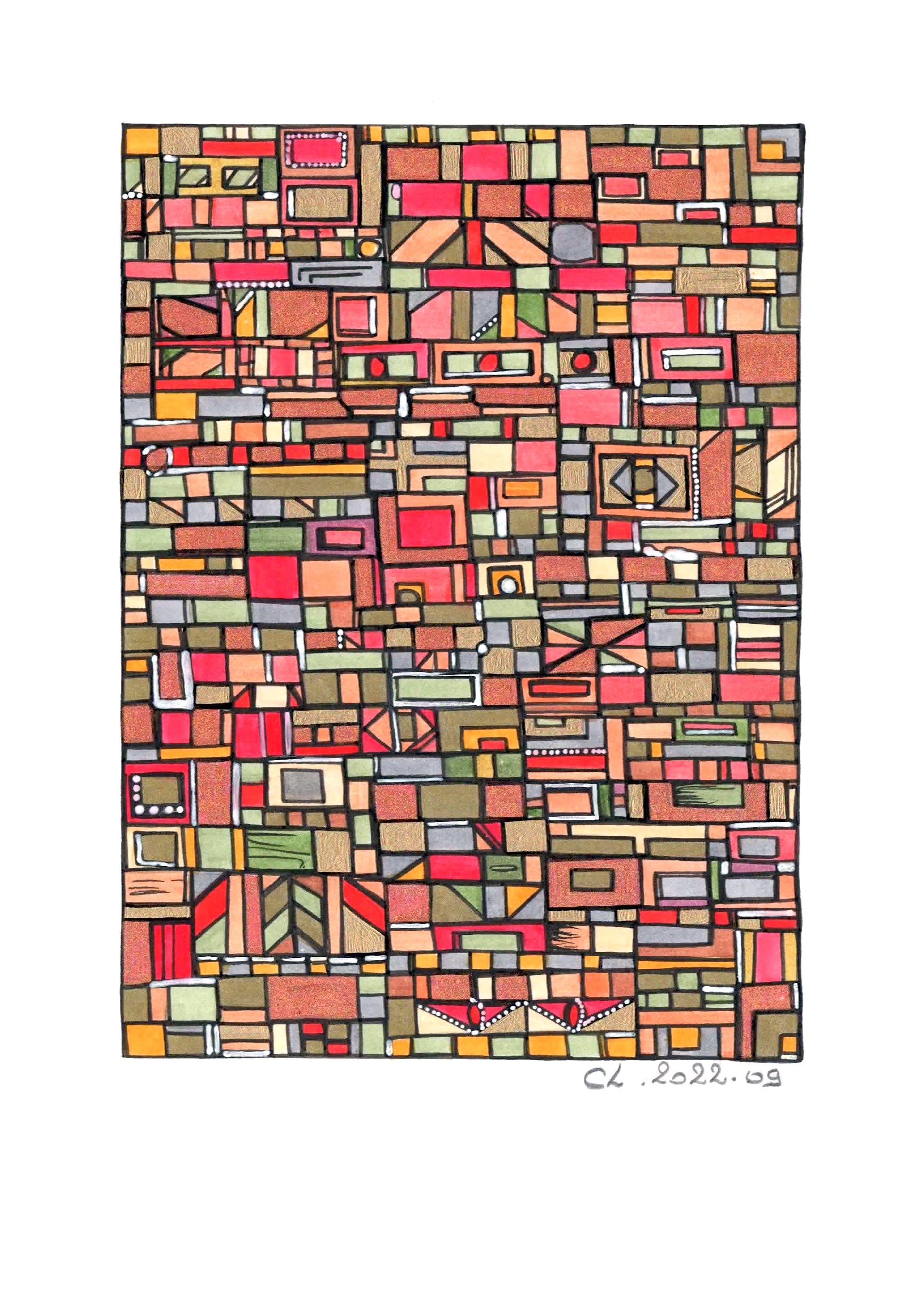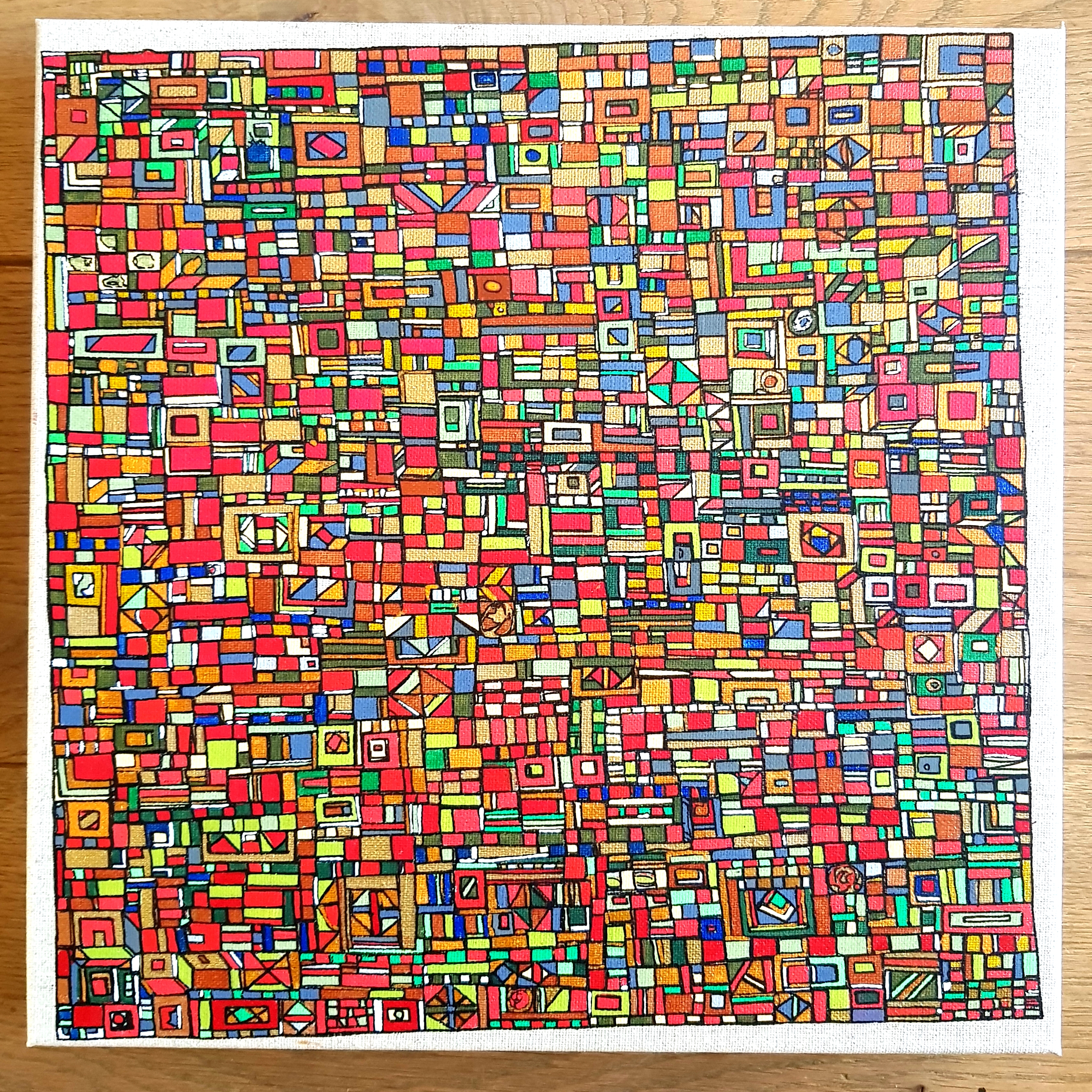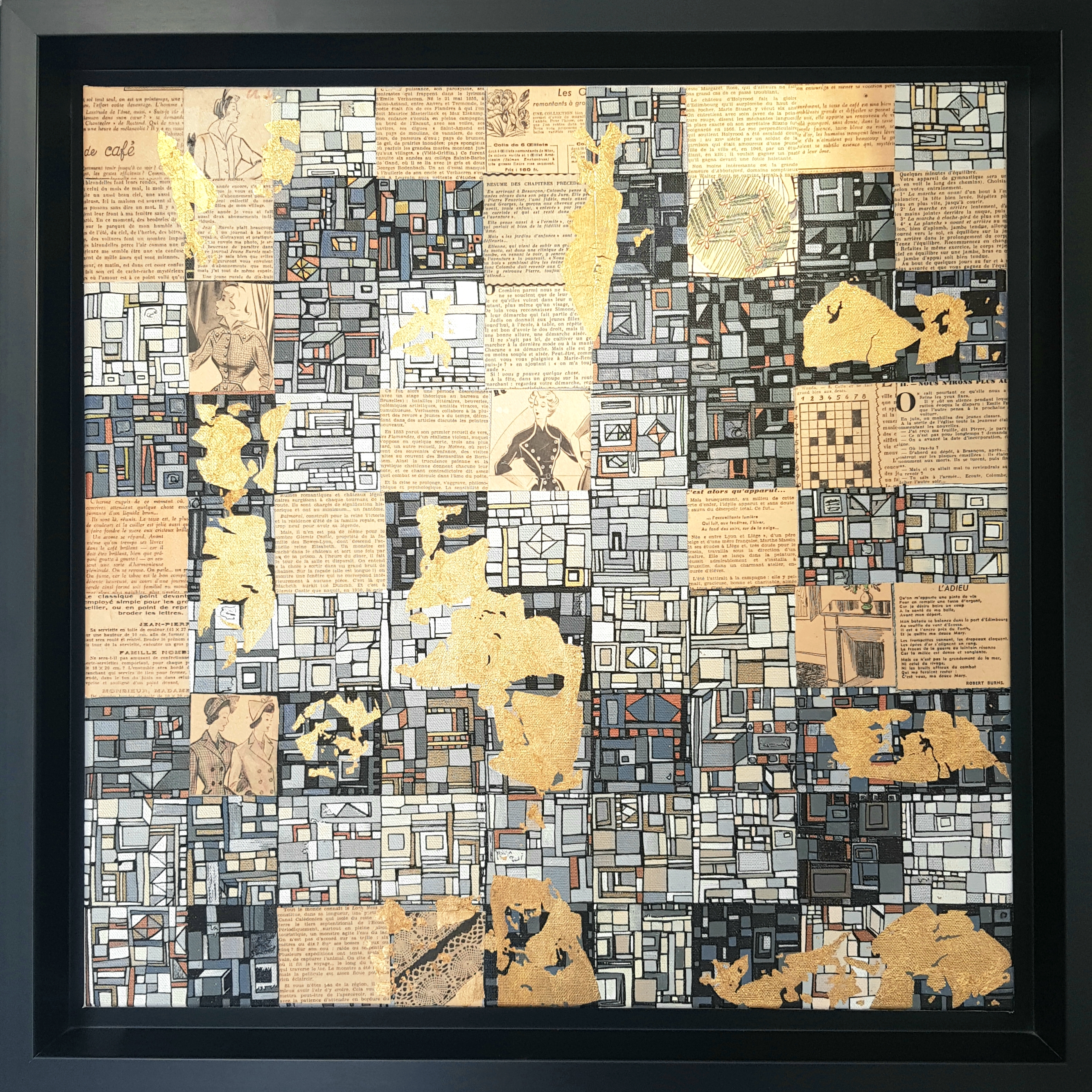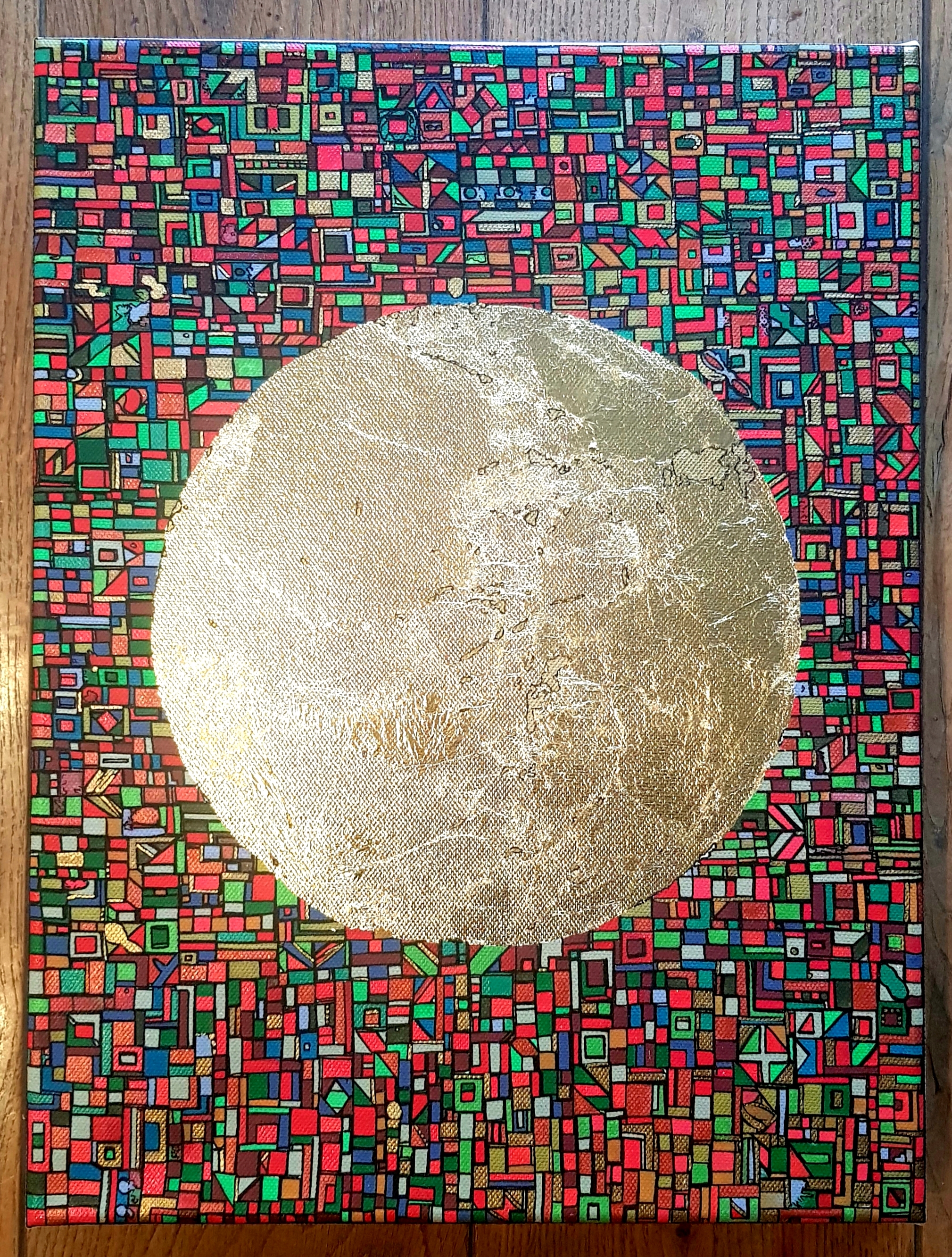 Charlotte Lalandes, artiste peintre rennaise, réalise des peintures aux techniques mixtes, dorure et feuille d’or sur toile, papiers et bois. Un univers haut en couleur, où celle-ci, est sublimée par des formes simples et surtout par une abstraction plus que voulue, elle est nécessaire. L’artiste recherche par cette épanouissante succession de formes le plus souvent géométriques, l’Emotion, celle qui est pure et propre à chacun. Un simple désir par la trame et la couleur, d’offrir au regardeur un sentiment d’allégresse et d’apaisement. Un travail sur la notion de geste répétitif et intuitif qui amène à entamer un voyage intime et souvent mystérieux, porté par une subjectivité spontanée.